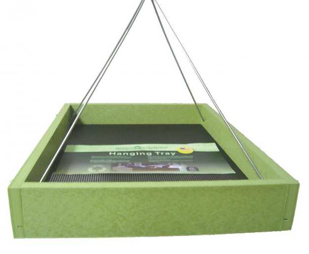The Green Solutions Large Hanging Tray Bird Feeder is made from 16 plastic containers. This feeder holds approximately 1.5 quarts of seed. Because this bird feeder is made from durable recycled plastic, it is virtually maintenance free. The feeder screens have rust-resistant polyester powder-coat finish so clean up is easy. Easy Care and Easy Clean! Keeps its new appearance year after year. Guaranteed never to fade, crack or split. Stainless steel fasteners for extra-durability. Steel hanging cable included. This quality feeder is proudly made in the USA!