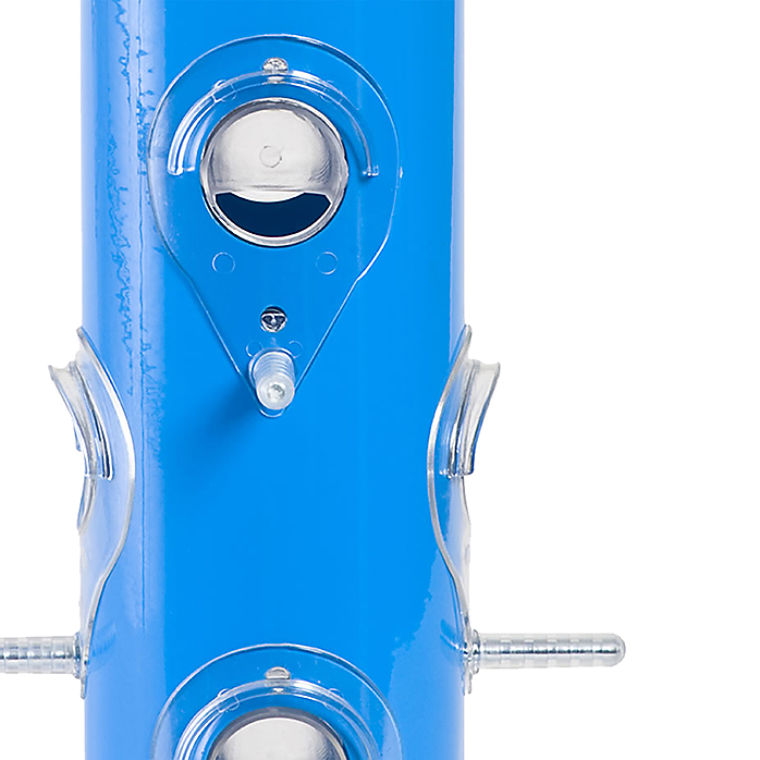 The Blue 6 Port Metal Tube Feeder brings superior durability to your bird-feeding routine! With a metal reservoir, lid, and perches, this feeder will easily stand up to the rigors of outdoor use. The metal components feature a powder-coated finish to withstand rust so this feeder maintains its appeal for many seasons to come!