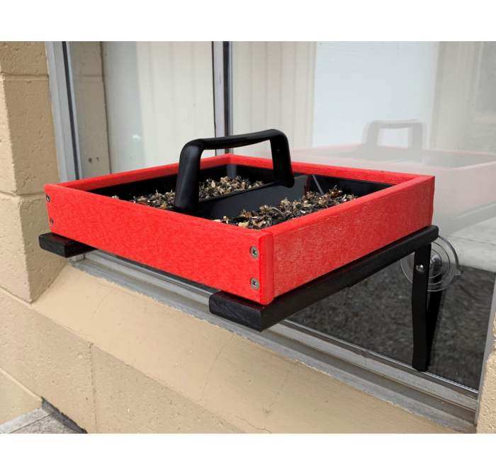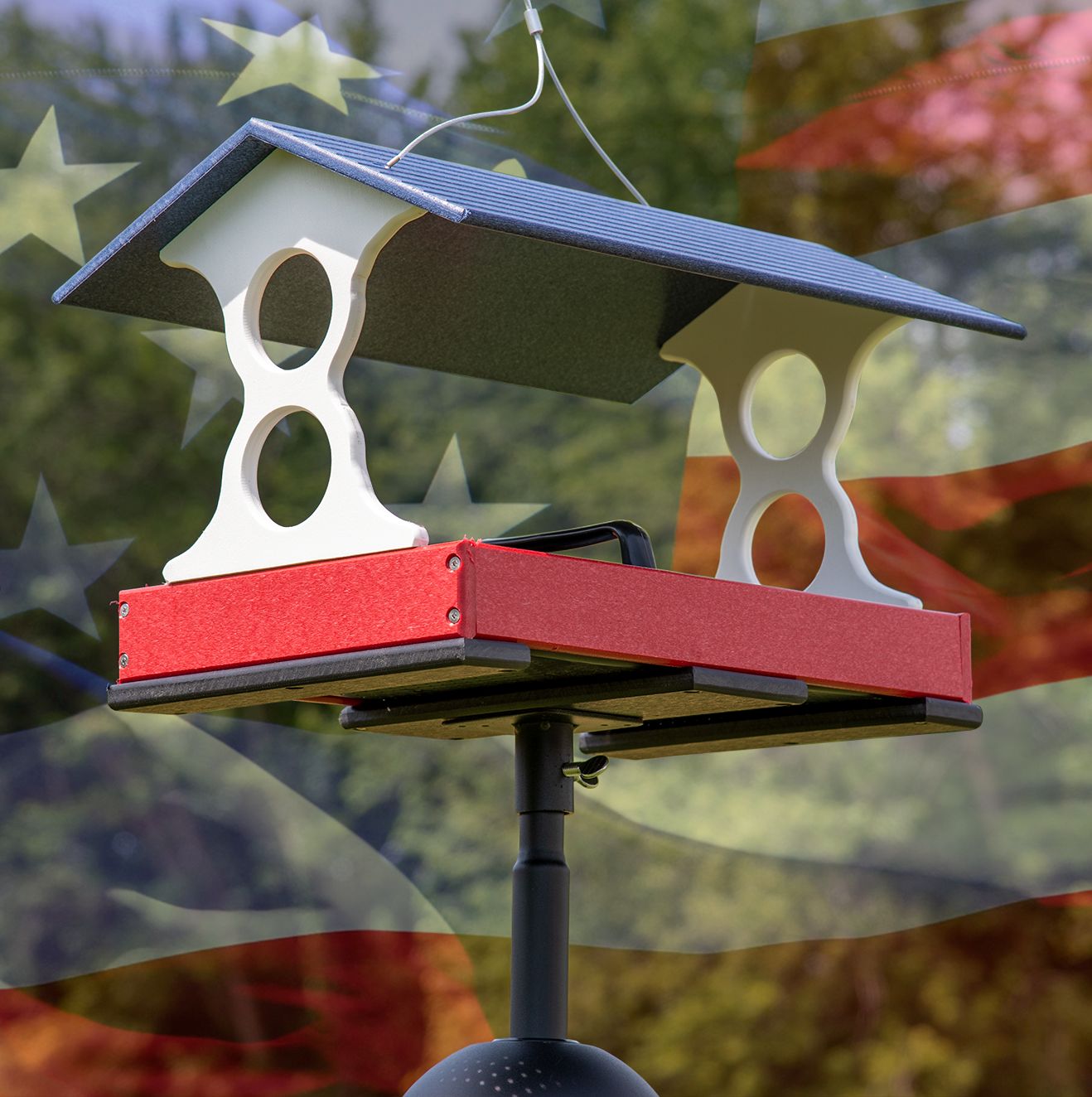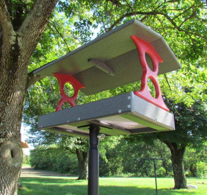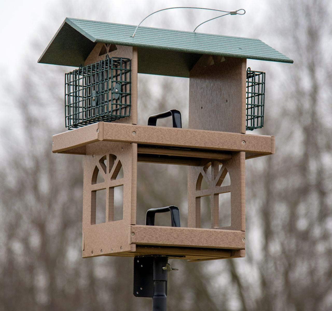 Recycled Poly Squirrel Jar Feeder - Featuring a one-gallon glass jar inside, this squirrel feeder can be filled with whole corn. whole-in-shell peanuts, loose corn, and other treats for your furry friends! Once filled with your choice of food, simply insert the glass jar into the feeder and your squirrels will be ready to snack. This squirrel feeder boasts two side entrances for your squirrels to easily access, and a specially designed cradle shape which keeps the glass jar from moving while the squirrels feed. An overhanging roof also keeps your food lasting longer and safe from rain and overhead messes, perfect for your squirrels. The Squirrel Jar feeder is also easy to install, with four pre-drilled pilot holes, a mounting bracket packet, and two 3" mounting screws. Made with sustainable recycled poly lumber guaranteed not to fade, split, or crack due to weather. Proudly made in the USA!