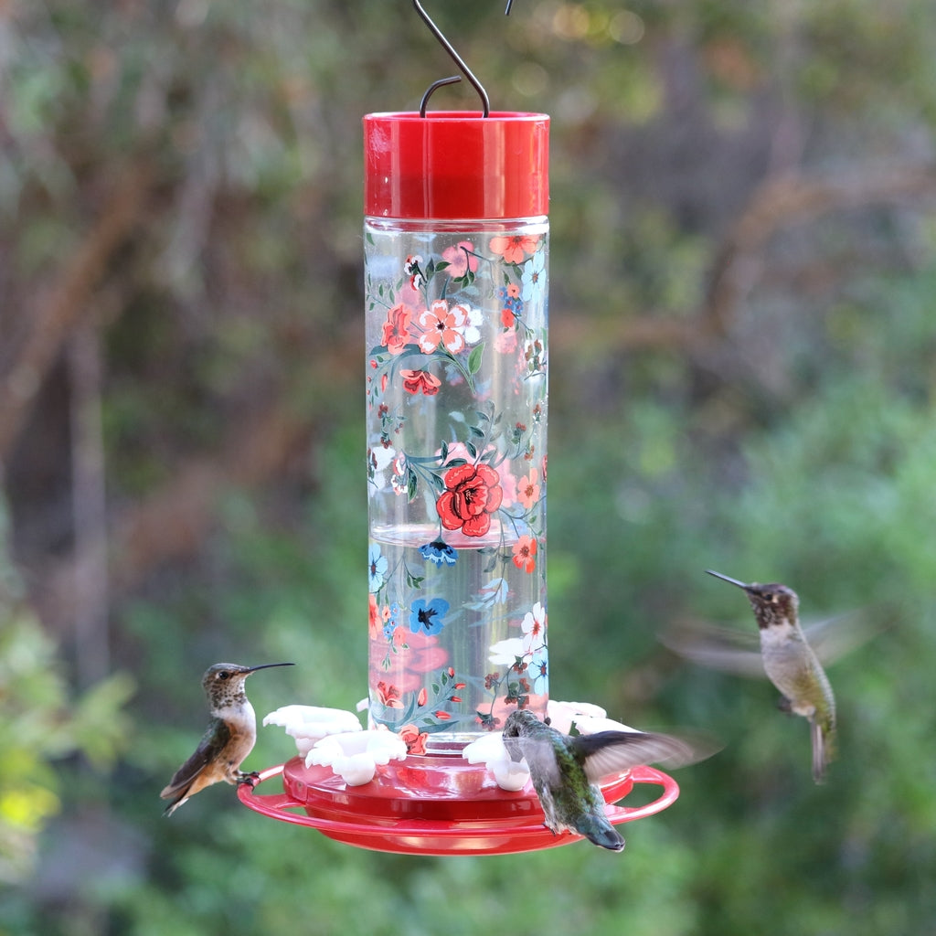 Vintage Blossom Decorative Glass Hummingbird Feeder - Featuring charming, vintage flowered patterns, this feeder is sure to become a fast favorite for you and the hummingbirds. A built-in continuous perching ring allows the hummingbirds to perch while feeding, which can increase feeding time and lead to even more hummingbird viewing. Flexible feeding ports optimize feeding comfort while also acting as Leak Free gaskets. The built-in ant moat cap can be filled with water to easily thwart these frequent feeder pests. A transparent glass nectar reservoir allows you to easily see if nectar needs refilled or replaced and all feeder parts are removable for a complete cleaning, extending the life of your feeder and keeping your hummingbirds healthy!