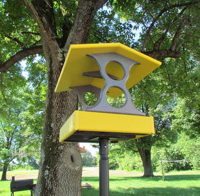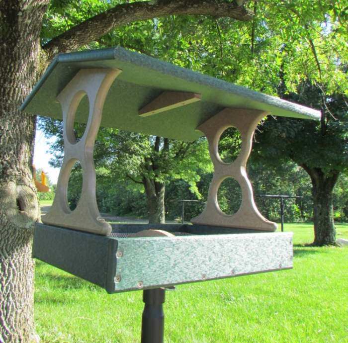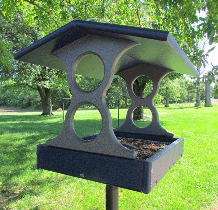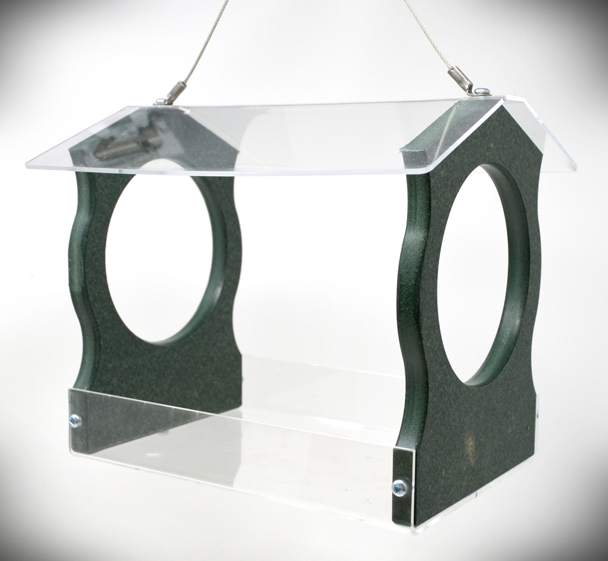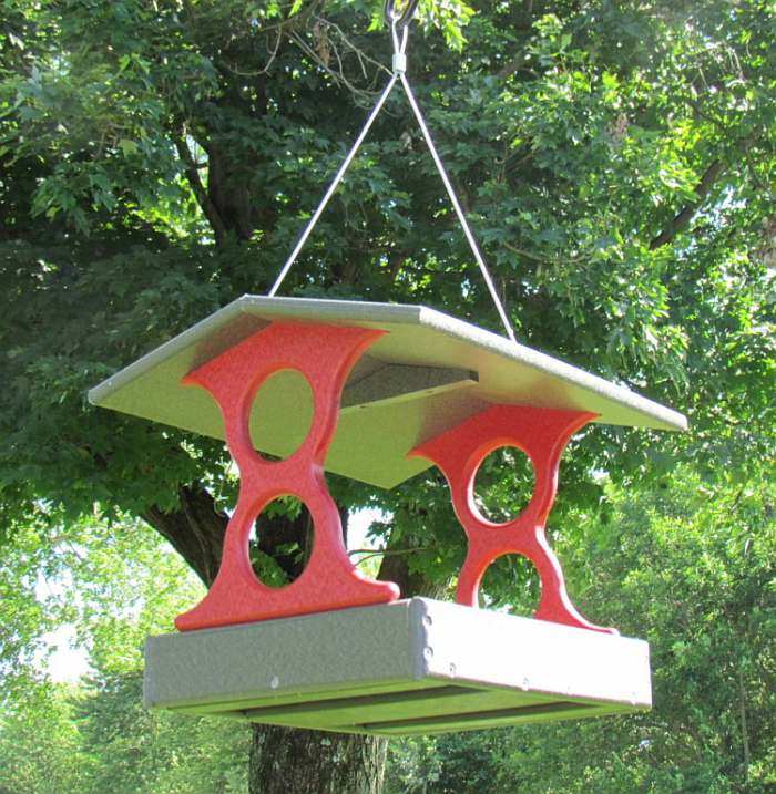 Recycled Poly Small Fly-Thru Hopper Bird Feeder Red - Environmentally friendly eco-birding products featuring PVC and polylumber. Polylumber is a state-of-the-art product consisting of post-consumer bottle waste such as milk jugs. Unlike wood, it doesn't fade, crack, split, chip or rot. Partnering polylumber with PVC, Rubicon creates innovative, yet traditional, designs in a variety of colors. All products carry an unconditional lifetime guarantee, even on squirrel damage! Acrylic roof provides view from all sides. Extra large entrance holes give birds a place to perch. Easy to clean and disinfect. Made in the USA.