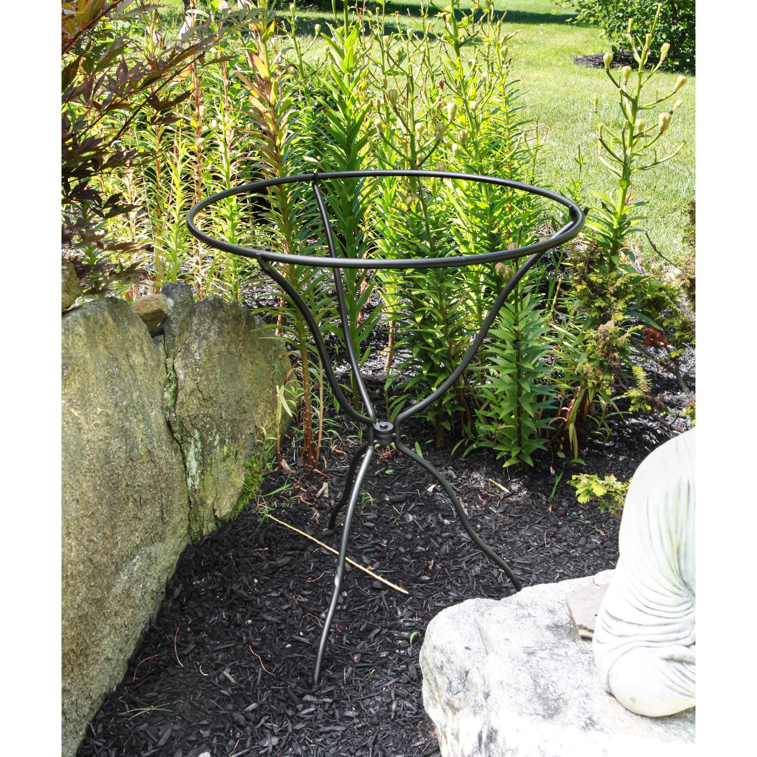 This circle of Three Hares, each sharing an ear, is a familiar ancient motif with varied meanings across Eastern and Western cultures. Adorning many medieval-era churches across England, In Devon, they are known as the "Tinner's Rabbits," and the circle was adopted as their trade's emblem. Our version features a design done in embossed Brass, enhanced with an Antique finish. The threaded base on the underside of the bowl attaches to the sturdy three-footed wrought iron Tripod Stand, a perfect choice for a small rock garden, low border planting, or intimate birdwatching on a tabletop or ledge. The Three Hares Birdbath with Tall Tripod Stand is a lovely garden accent that will provide water in your backyard habitat year-round.