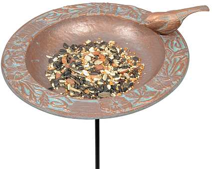 Chickadee Stake Feeder - These garden feeders are carefully finished with weather-resistant verdigris paint finish to withstand any climate. Our Garden Design Stake feeders will provide years of bird watching enjoyment. A 16" stake is included to mount your brand new Garden Design Stake Bird Feeder.