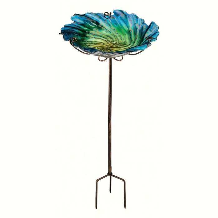 The Blue Birdbath/Bird Feeder Ground Stake is a beautifully crafted art glass bowl that stands proud with a stable three pronged base providing the perfect area for feathered friends to visit! Can be used as a birdbath or bird feeder. 12" diameter bowl, 25" tall. Makes a wonderful gift for the backyard birding enthusiast and gardener!