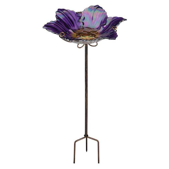 The Purple Birdbath/Bird Feeder Ground Stake is a beautifully crafted art glass bowl that stands proud with a stable three pronged base providing the perfect area for feathered friends to visit! Can be used as a birdbath or bird feeder. 12" diameter bowl, 25" tall. Makes a wonderful gift for the backyard birding enthusiast and gardener!