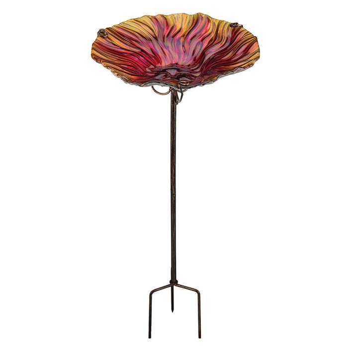 The Red Birdbath/Bird Feeder Ground Stake is a beautifully crafted art glass bowl that stands proud with a stable three pronged base providing the perfect area for feathered friends to visit! Can be used as a birdbath or bird feeder. 12" diameter bowl, 25" tall. Makes a wonderful gift for the backyard birding enthusiast and gardener!