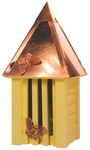 Architectural elegance for your butterflies! This is a companion piece to Heartwood's Gatehouse for birds. Solid copper roof! Select cypress siding with authentic corner boards and a hip roof give this shelter a unique style. Slotted front and decorative copper butterflies invite your winged friends to stay for a while. Comes with its own screw-in mounting stake and copper covered cleanout.