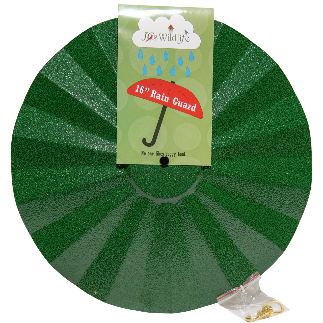 Medium 16" Metal Rain Guard Green - Featuring a sturdy hook on the under side of the metal cover, hang your choice of bird feeders or bird seed cylinders closely underneath this medium size cover for maximum protection from weather and overhead messes. This rain guard is treated with a protective powder coat paint which will stay vibrant in your garden for seasons to come. Functionality with flair! Keep your bird seed dry, and your birds will be happy and healthy! Proudly made in the USA!