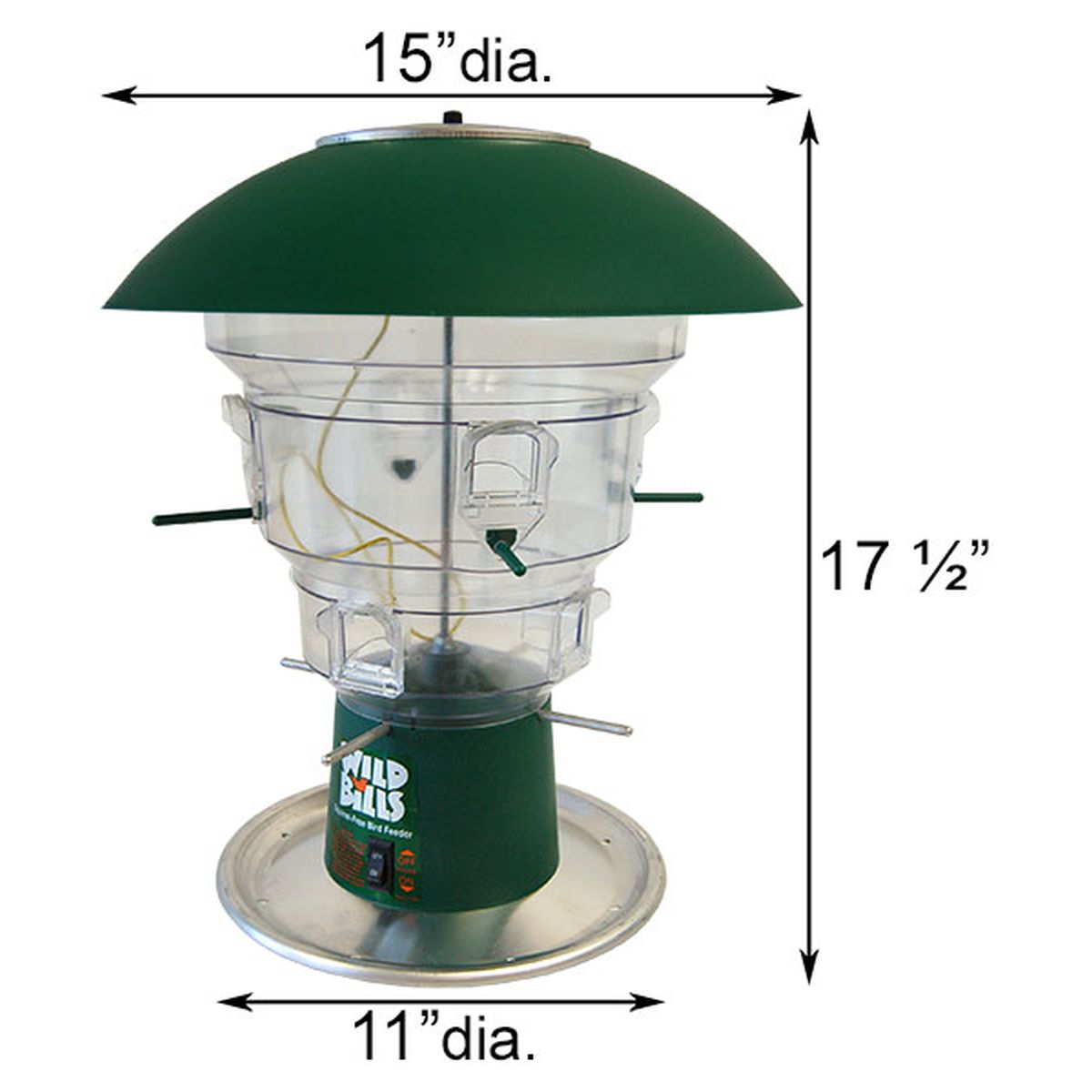 The feeder has a huge 10 quart (2.5 gallon) seed reservoir that will reduce the number of trips you make outside to fill the feeder. The clear plastic feeder reservoir is UV treated. The 8 feeding stations have individual perches designed by an ornithologist for maximum feeding comfort. The 11" aluminum metal tray catches seed to prevent waste and is equipped with drainage holes. The large 15" feeder dome protects the seed from the elements and may be removed for easy cleaning and filling. This feeder may be hung with the included 15" metal hanger or pole mounted. The electronic system is powered by a single 9-volt alkaline battery (not included). One year limited warranty. Made in the USA!