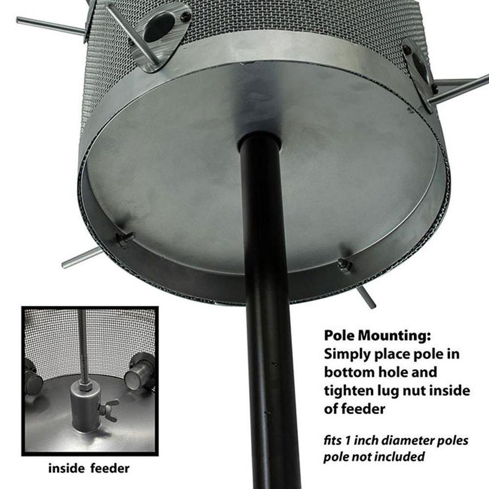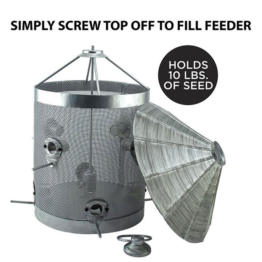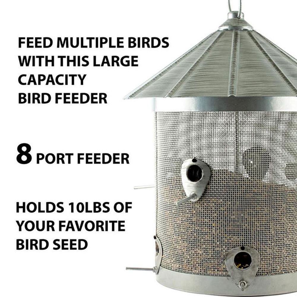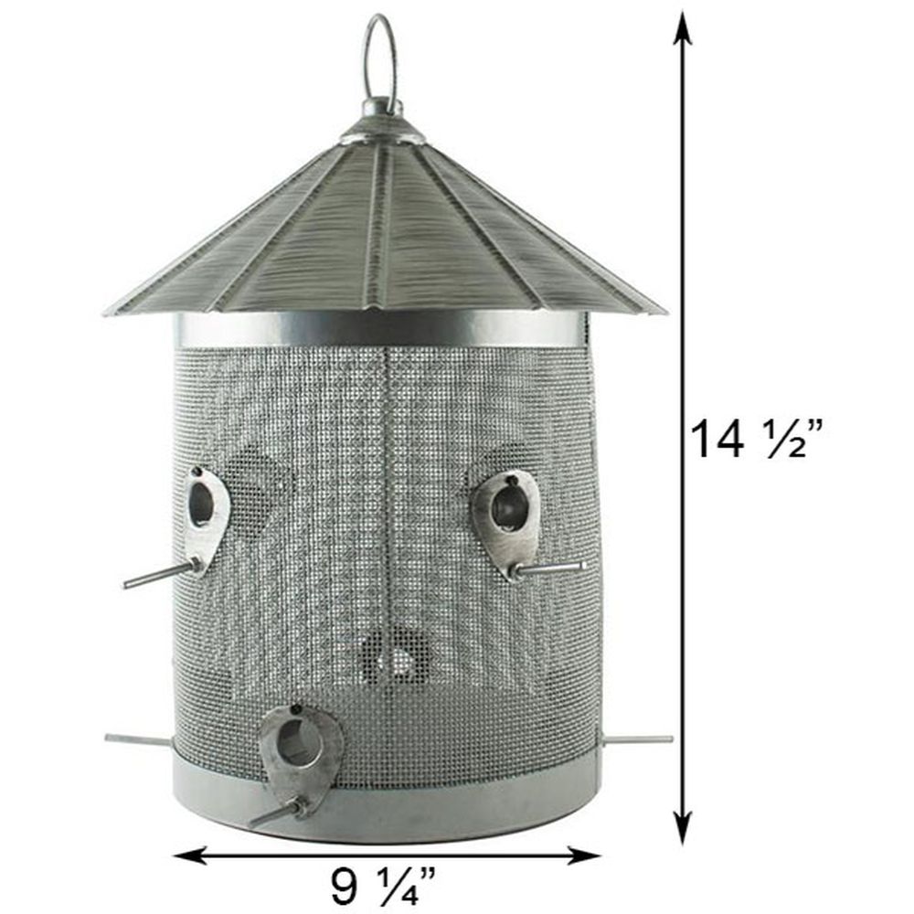 Rustic Farmhouse Mesh Silo Bird Feeder - Continue the country chic motif of your home décor into your landscaping with the Rustic Farmhouse Mesh Silo Bird Feeder. The robust, steel construction and gray hues of this unit enhance its farmhouse style, completed by its classic shape. The cylindrical, mesh body holds 8.75 quarts of sunflower seed, mixed seed, or peanut splits, and 8 ports around the reservoir allow a few birds to dine. A perch beneath each port provides a spot for your feathered friends to rest and reach the seed, while clinging birds can grip the mesh cylinder for added avian activity. A generous, 12 paneled roof fully covers the reservoir, protecting seed from the elements, and a steel rod through the center of the piece adds strength and stability. Unscrew the top knob to remove the roof and clean or refill the item, and hang the feeder with the metal loop for easy placement. The unit can also be pole mounted using a 1" outer diameter pole (not included), and the steel construction forms a hardy station. Continue the timeless tradition of feeding birds by placing the Rustic Farmhouse Mesh Silo Bird Feeder in your yard.