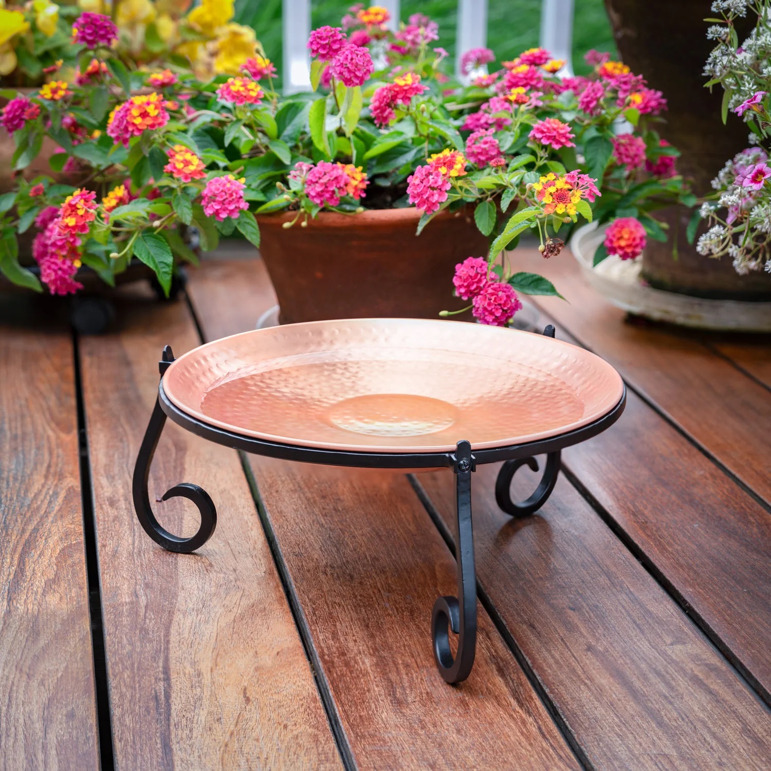 Low-Profile Multi-Purpose Solid Copper Bird Bath - This multi-purpose freestanding copper basin doubles as a birdbath or a feeder, catering to your choice. Constructed from heavy gauge copper, it features a rolled edge for added support and durability. The naturally antimicrobial plate is an ideal depth for birds to frolic in the water or serve as a communal feeding station. The hand-forged solid steel stand is easy to assemble and boasts three scrolled legs. A beautiful work of art, this piece adds charm to gardens and patios alike!