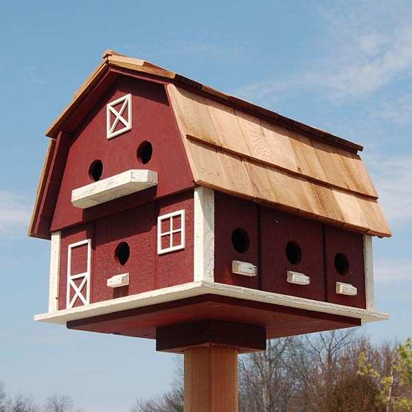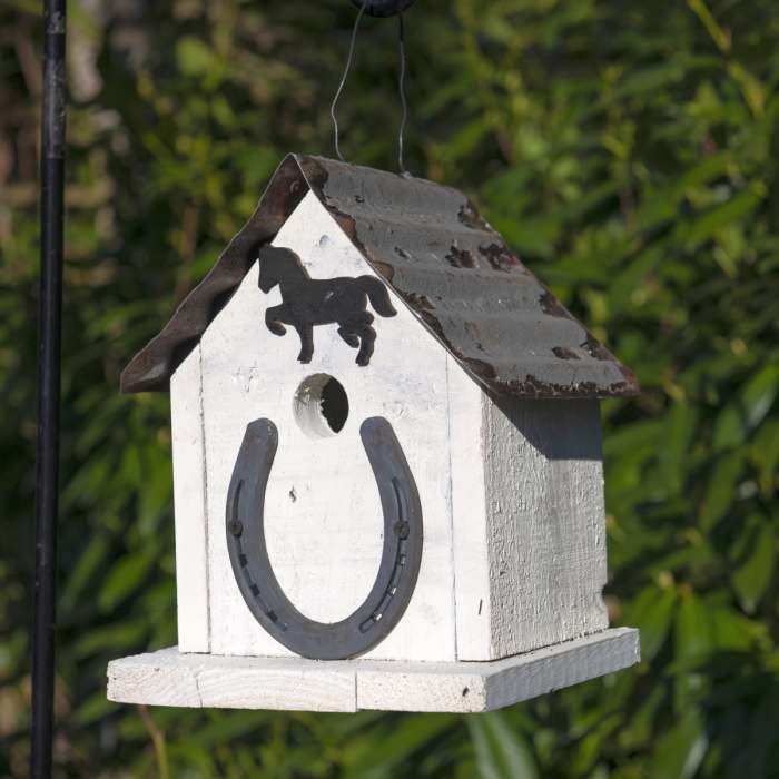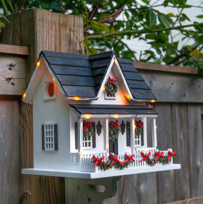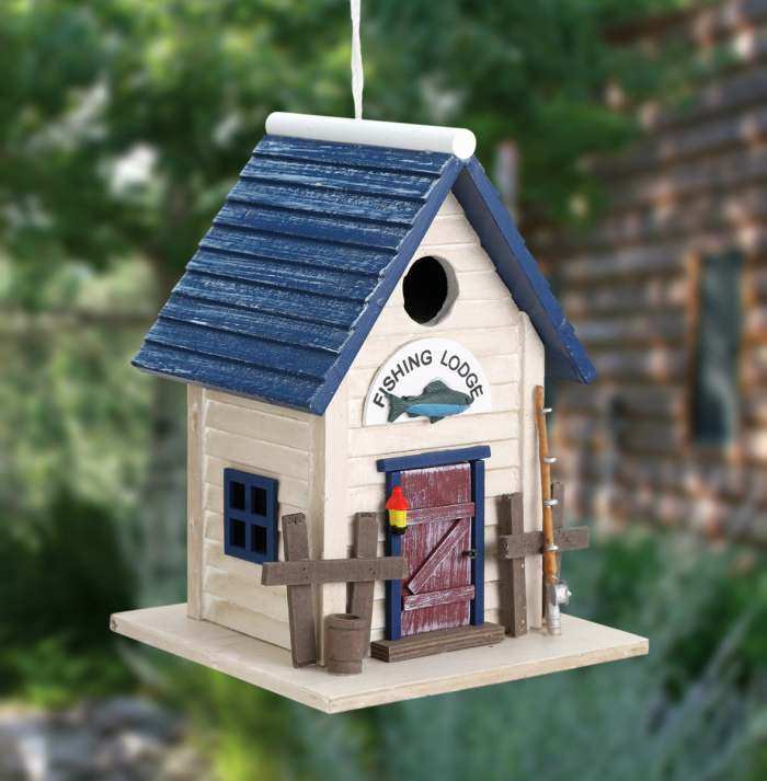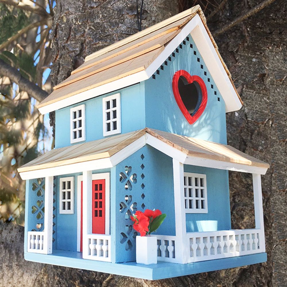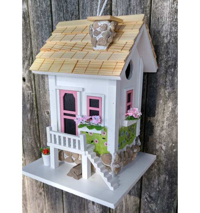 Provide songbirds a luxurious coastal retreat when you place the Lakeshore Cottage Bird House in your yard. The gorgeous details, bright coloration, and lakeside motif of this dwelling bring ample charm to your bird sanctuary, and the wood construction of the unit lends substantial and lasting appeal. A steeply pitched roof, covered in slate blue wooden shingles, gives realism and color to the domicile, enhanced by planter baskets filled with faux foliage situated on the home's front columns. Brown accents border the front door and windows, and a detailed figure of a wreath rests on the inviting entry to complete the presentation. Small steps lead up to the doorway for added detail, while a 1.25" diameter entry hole rests near the top of a side panel, letting small songbirds gain easy passage to the solace of a cozy chamber.