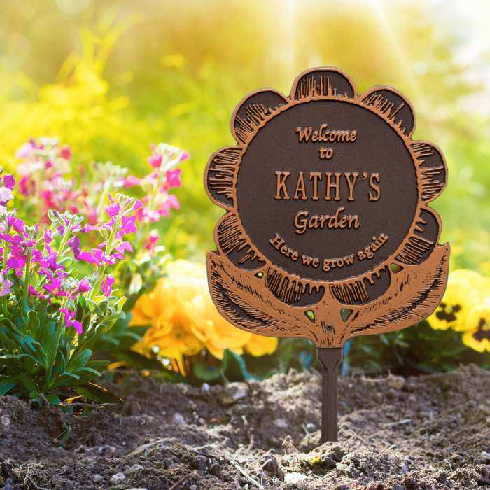 Each custom made sign is hand cast one at a time, ensuring quality. A detailed graphic in the shape of a flower petal and the quote 'Here we grow again" decorates this Personalized Lawn Garden Sign with an elegant finishing touch.