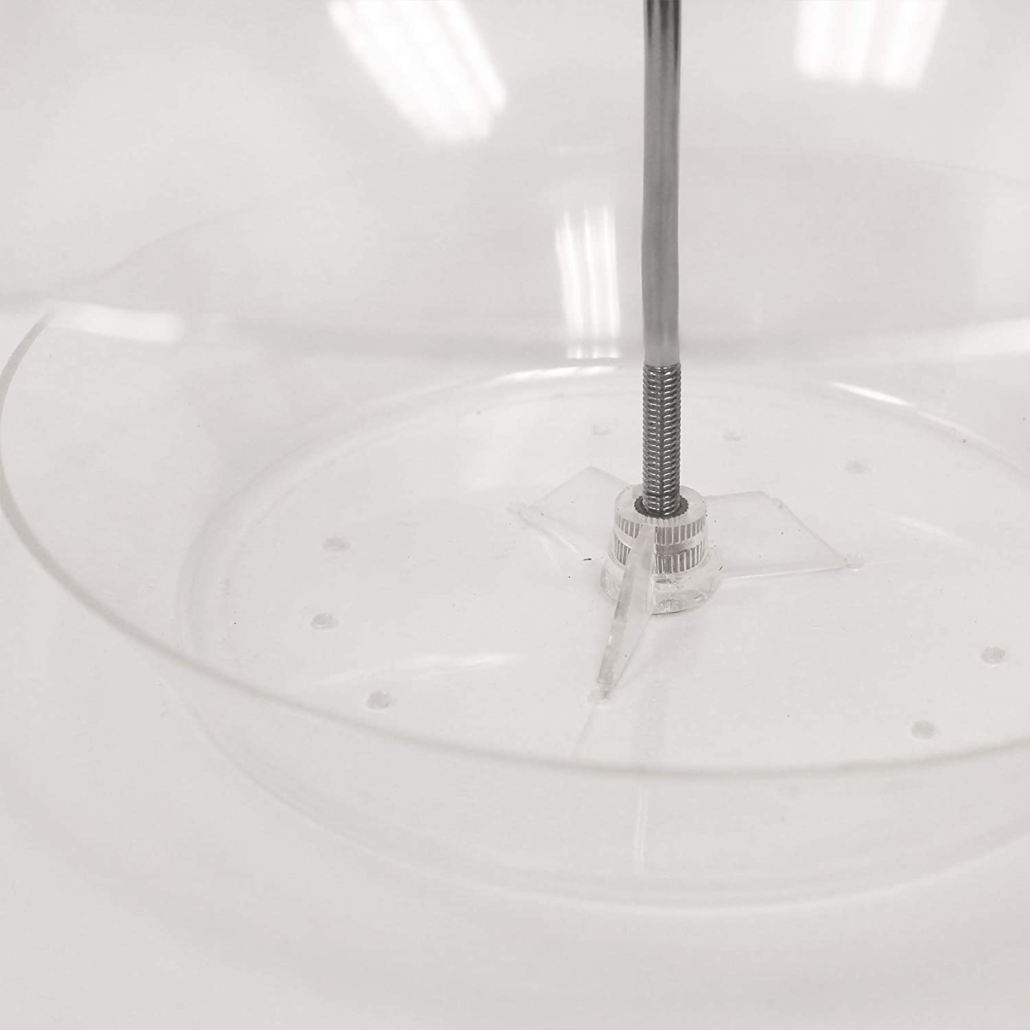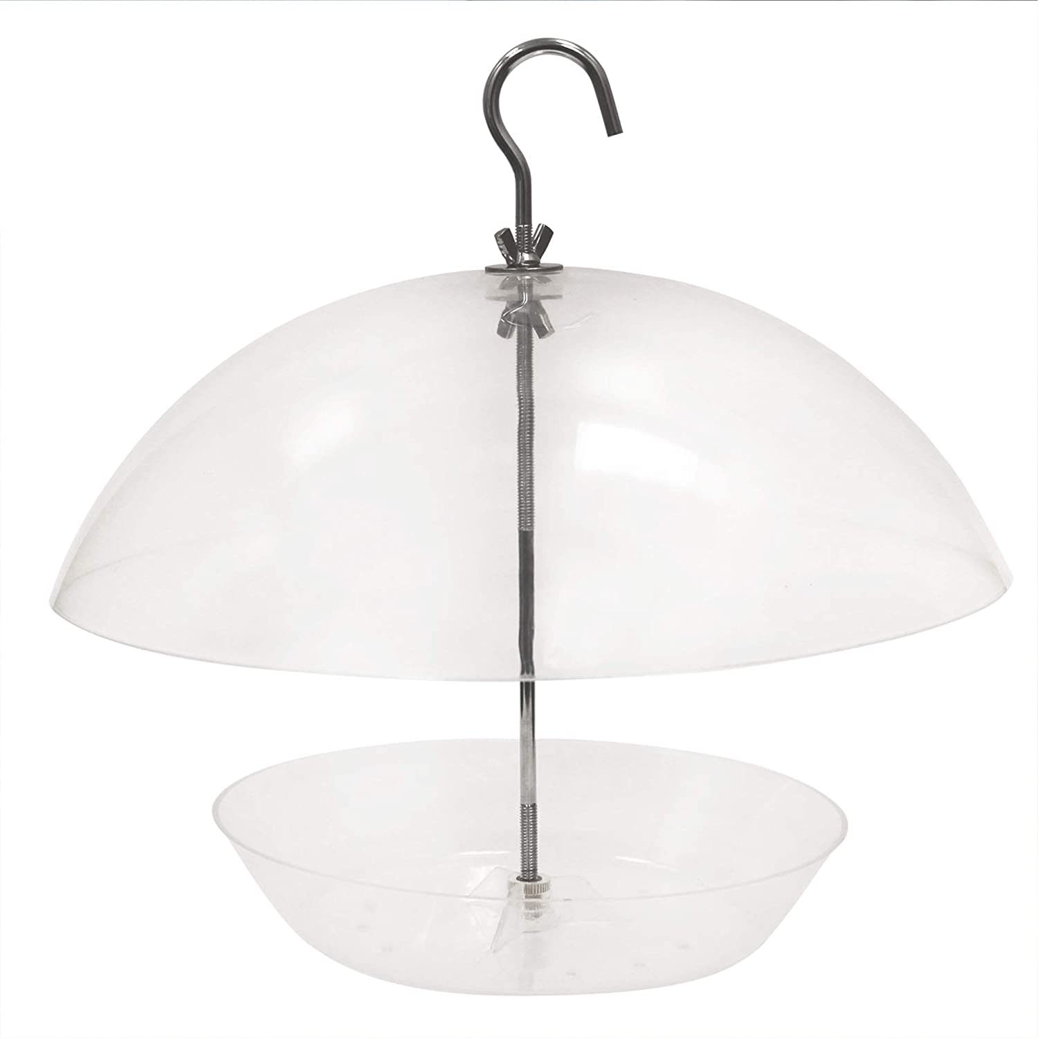 Enjoy watching birds dine privately in your backyard from the Observatory Domed Bird Feeder. This versatile station is perfect for offering small birds a secluded dining spot, with its generous dome and flared base platform. The bottom, 8” diameter dish holds 0.75 quarts of fruit, mealworms, suet nuggets, or seed, inviting a bevy of different birds to dine. A 12” diameter dome fully covers this dish, protecting it from the elements, while drainage holes on the base tray help feed remain dry and fresh. A metal rod supports the dome, and a wing nut and washer help keep it in place. Raise or lower this wing nut on the rod to alter the placement of the dome, to further protect seed from squirrels or larger birds. Unscrew the base tray from this metal rod to clean or refill the piece, and use the hook at the top of the rod to hang the item from a bracket or branch. Its plastic construction withstands exposure to the elements throughout the year, and the clear finish allows you to see all the avian activity.