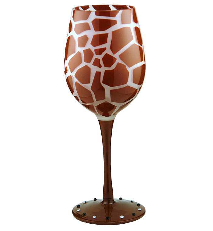 Giraffe Bottom's Up Wine Glass - This collectible 9 inch tall stemmed wine glass has touches of hand painting over a silk screening. Some glasses may have dimensional painting and or crystal accent stones. It has a pulled stem and holds 15 ounces. Each glass is packaged in a gift box. The decorative wine glass is a practical presentation that is useful and displayable. Care instructions: Hand wash ONLY with mild soap. Do not use in microwave. Do NOT soak.