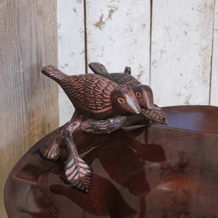 This beautiful brass birdbath has a soft bowl with two cheerful songbirds perched on the wide undulating rim!