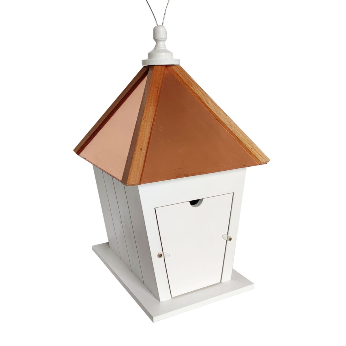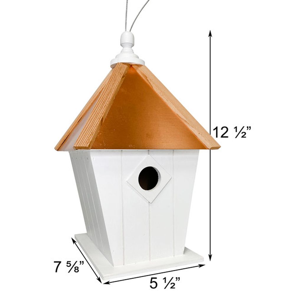 Paxton Birdhouse with Metal Cable - The Paxton Birdhouse is both elegant and functional. The roof is genuine copper and trimmed with Western Red Cedar. Wrens, finches, nuthatches, chickadees and titmice are the likely residents. This birdhouse can be hung anywhere from its sturdy metal cable. Solid wood construction. The back wall is removable for easy clean-out. This timeless birdhouse will add a traditional look to your garden. 1.25″ entry hole.