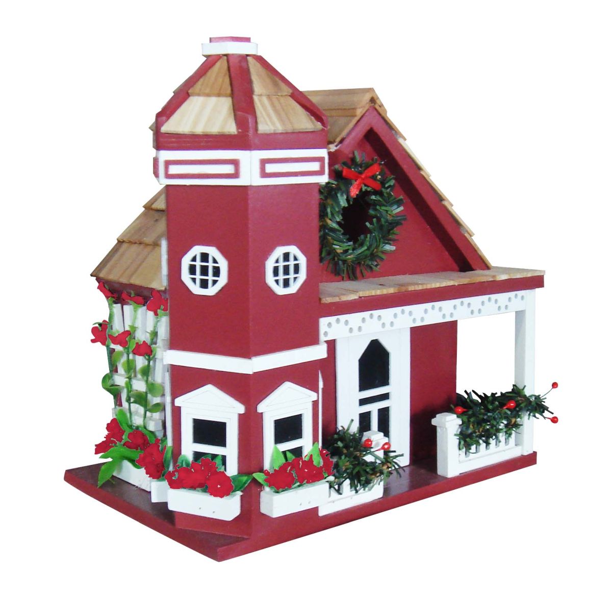 Our Yuletide Cottage Birdhouse in red is a Victorian gem with flowers galore and a classic, roof-top turret. A removable wreath detail and a pair of sleigh bells complete the classic holiday design. Constructed of exterior grade ply-board with poly-resin details. This style is a fully functional birdhouse with removable back walls, drainage, ventilation, mounting bracket and a 1.25″ entry hole perfect for small songbirds such as Wrens, Chickadees, Nuthatches Titmice and others. Available in red or white colors. Makes a wonderful gift for the backyard bird lover!