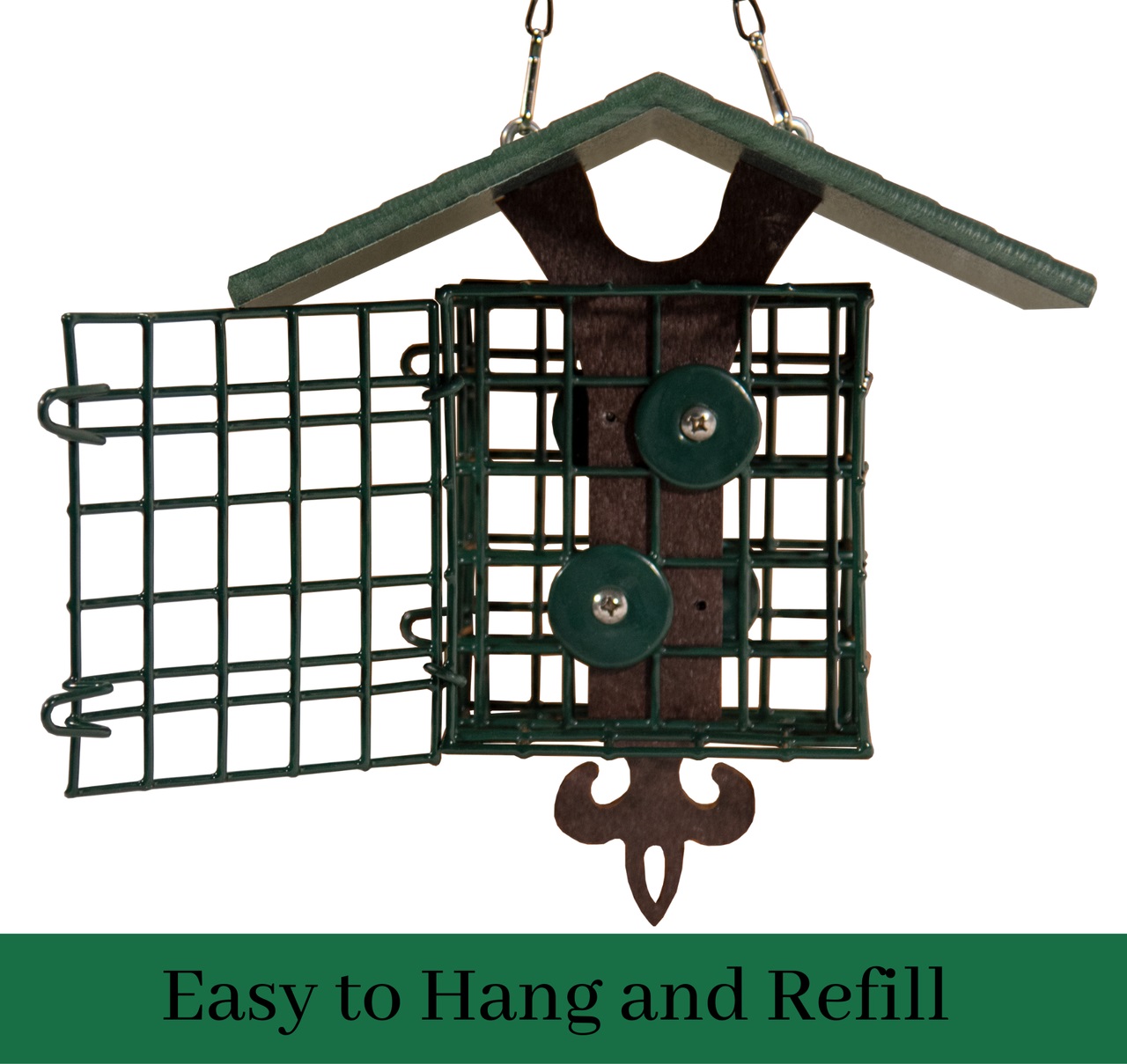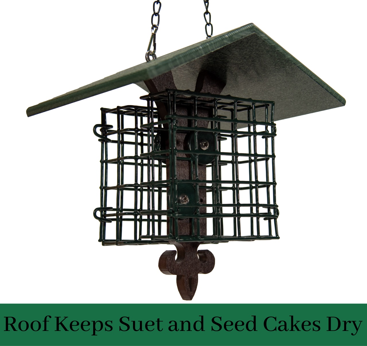 Recycled Poly Roof Double Suet Cage Fleur De Lis Green - Our sturdy double suet cage is now available with its own roof to stay clean and dry. Your suet will stay protected from above, safe from overhead messes and dripping water which can make even the best cakes crumble. This included roof is also made of durable eco-friendly Recycled Poly Lumber, and is guaranteed not to split, crack, or fade due to weather. Easily refill this PVC coated wire suet cage via the front swinging door, which won't fall open and drop your cakes. This suet cage accommodates 2 standard-size suet block or seed cakes comfortably. Our suet cage bird feeder can also be hung or mounted via the included hanging chain or two included mounting screws, ready for the perfect spot in your garden. Once mounted, simply open the front of the suet cage and insert your favorite suet or seed cake, and you are ready to feed your feathered friends. Proudly made in the USA!