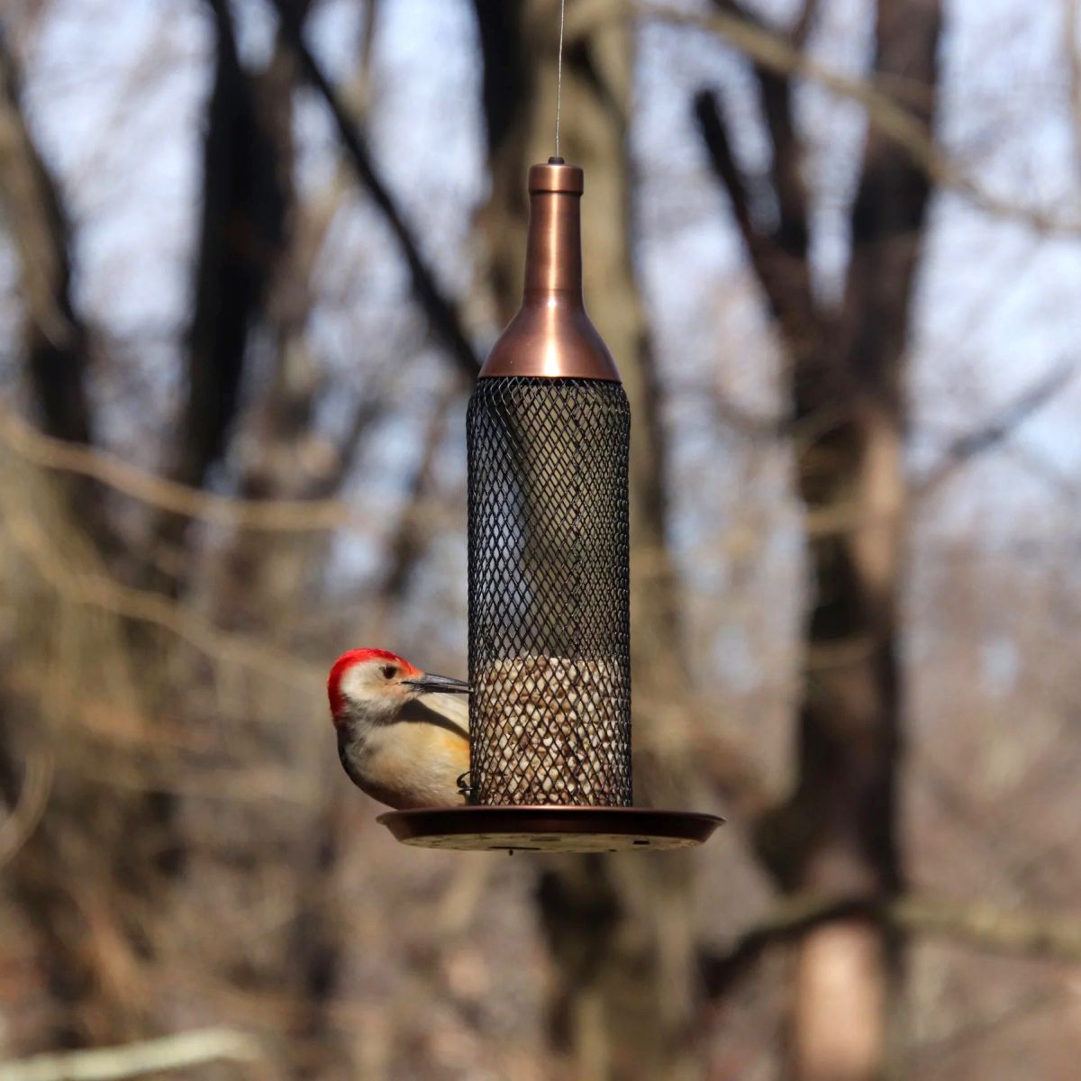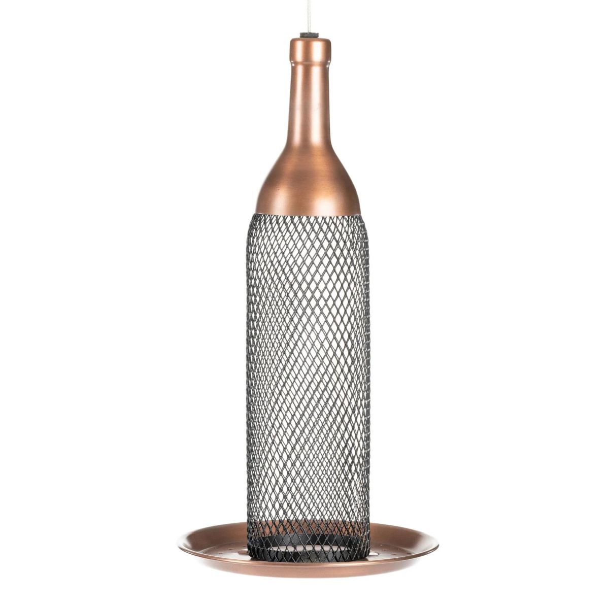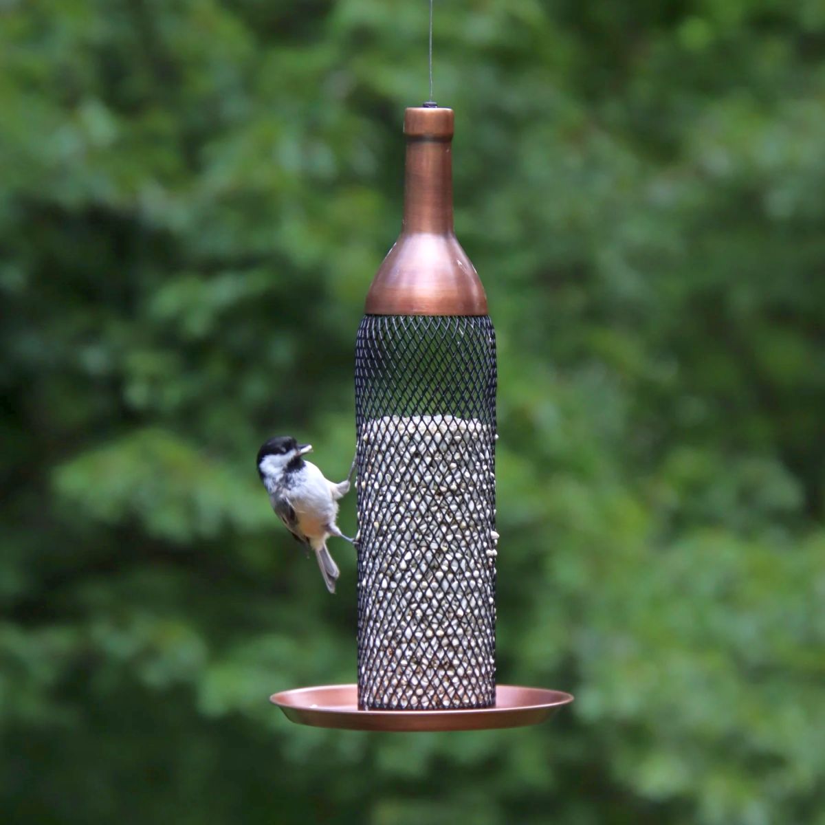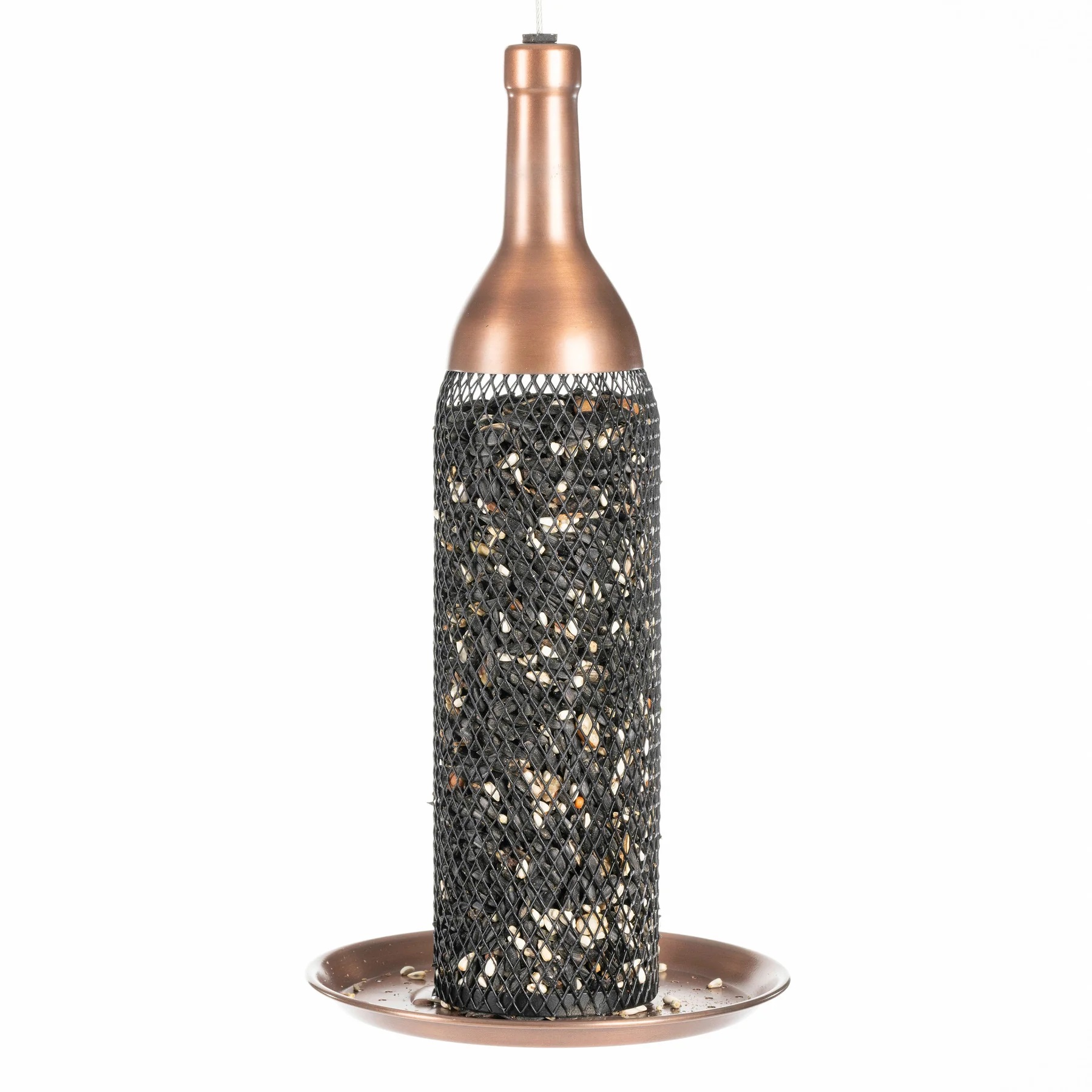 Vineyard Select Mesh Bird Feeder - Summon your feathered friends to feast at this enchanting wine bottle-inspired feeder. The patented copper finish accents with mesh tube allows for multiple birds to dine together. And if they get carried away, a raised lip on the tray will keep the seeds from ending up all over the yard! Easy to fill and drainage holes keep seeds dry, the feeder is sized to hold 1.5 pounds of seed including sunflower, safflower, shelled peanuts, or large seed blends. Makes a wonderful gift for backyard bird enthusiasts!