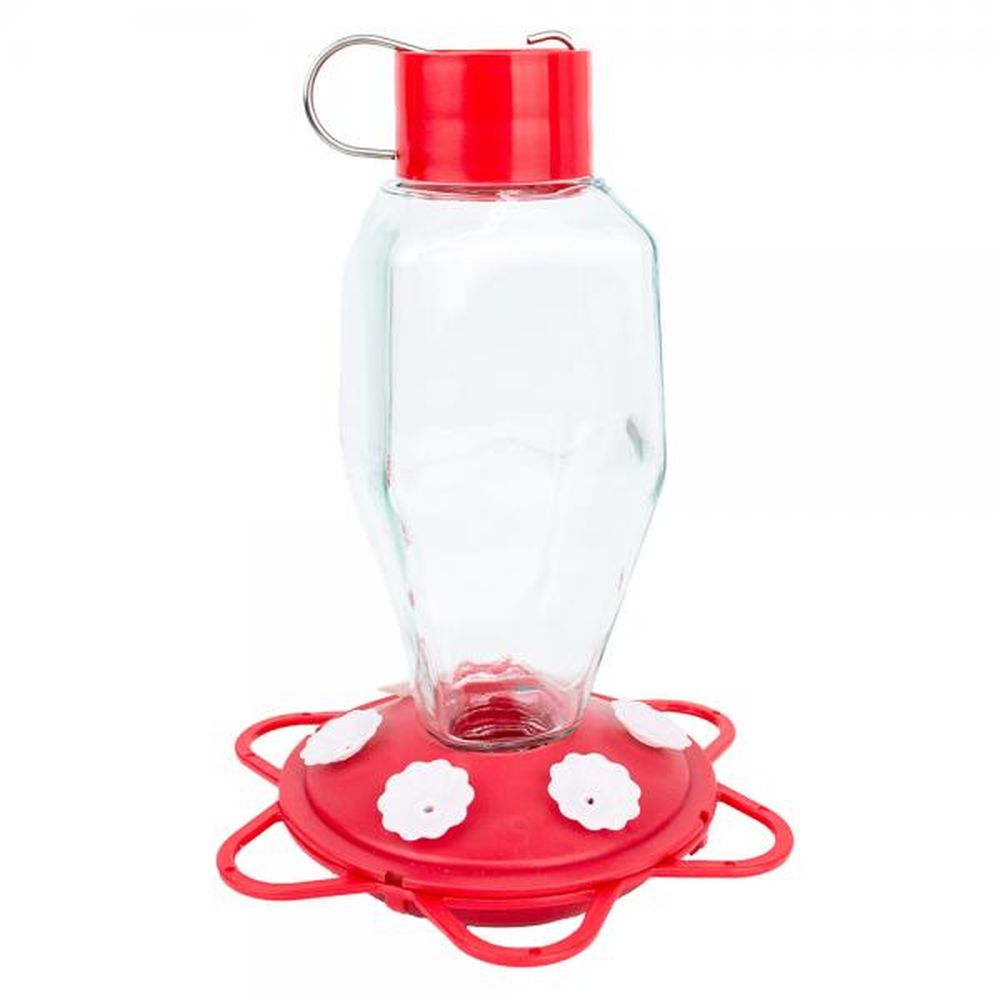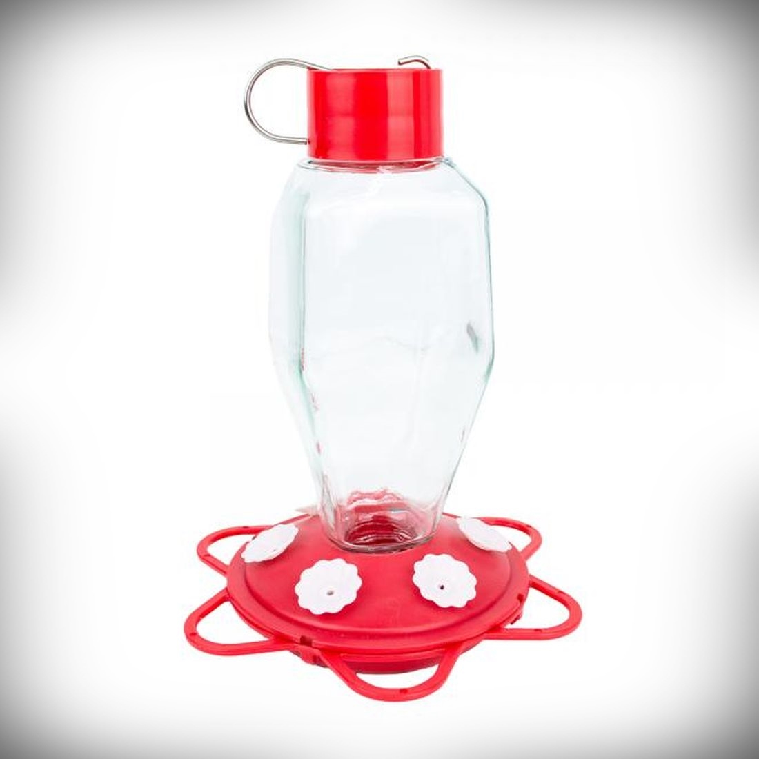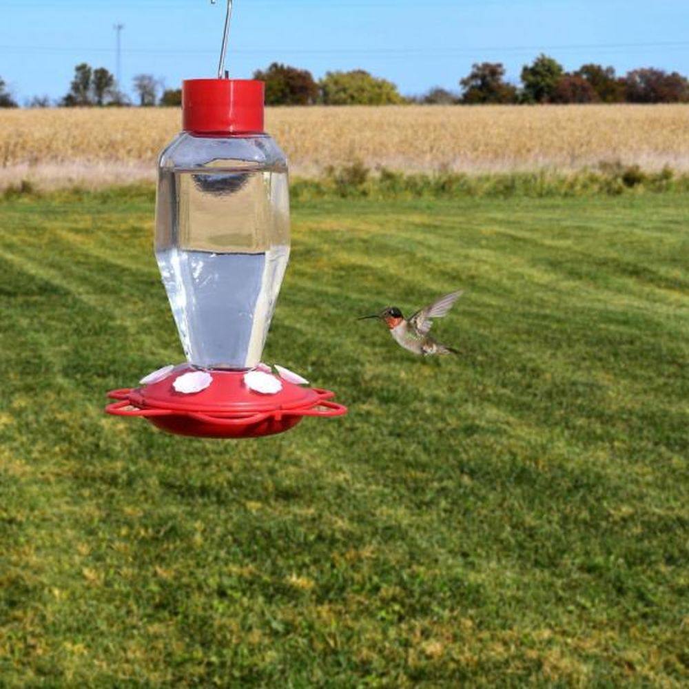 Glass Bottle Hummingbird Feeder 20 oz. - Attract frolicking hummingbirds to your yard with the 20 oz. Glass Bottle Hummingbird Feeder from Backyard Essentials. Included hook at top of feeder allows for easy hanging anywhere. Six integrated perch feeding stations ensure there's enough room for multiple birds to feed simultaneously. Easy to clean and fill. Dishwasher safe. With a generous 20 ounce nectar capacity and 6 flowered ports, this feeder keeps your hummingbirds happy and coming back for more!
