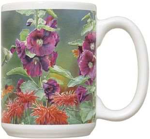These large 15 oz ceramic coffee mugs are both dishwasher and microwave safe. The colorful image of the Hummingbird wraps around the mug. Great for year-round gift giving. Designed by artist Susan Bourdet. Made in the USA.