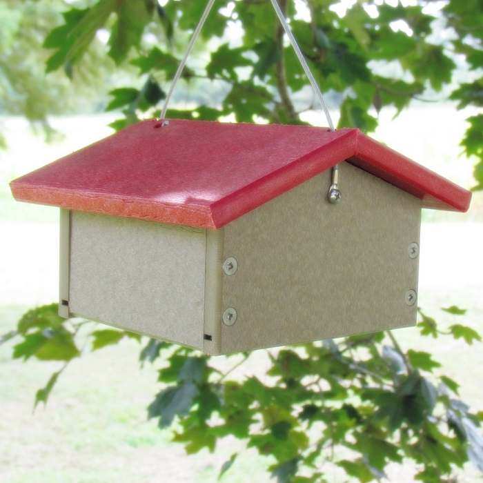 Recycled Poly Single Tail-Prop Suet Feeder - These quality crafted eco-friendly hanging single tail-prop suet feeders are made from durable weather resistant 100% recycled 5/8" poly lumber. Lifetime guarantee to never crack, split or fade. Rust-free stainless steel screws. Hanging cable included. Easy to clean and fill. Available in Red/Tan, Blue/Gray, Green/Brown, or Green/Tan Poly Colors. Holds 1 standard suet cake. Proudly made in the USA!