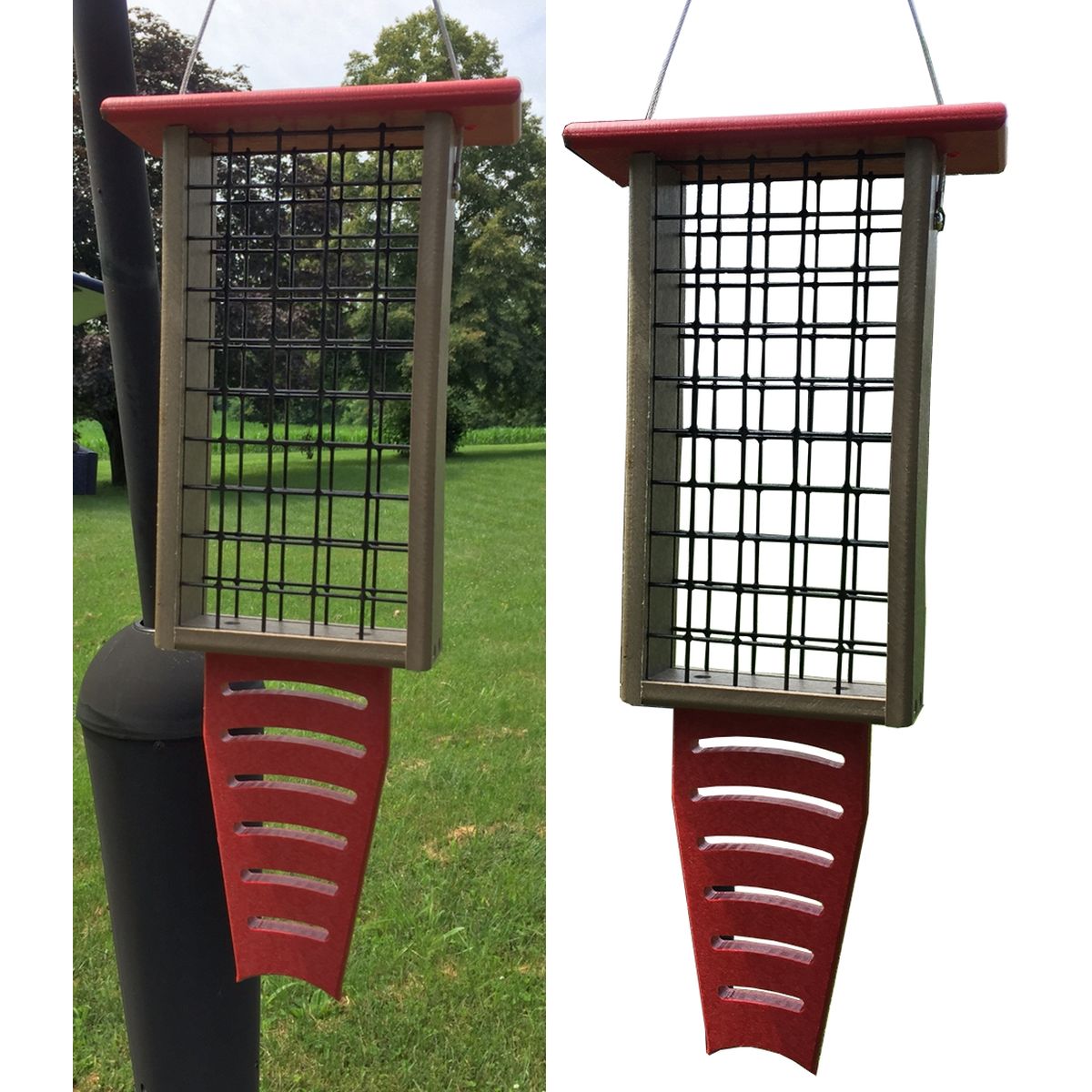 These quality crafted eco-friendly hanging upside down suet feeders are made from durable weather resistant 100% recycled poly lumber. Guaranteed not to fade, peel, rot, crack, chip, or warp. Easy for birds to see suet. Rust-free stainless steel screws. Hanging cable included. Easy to clean and fill. Red poly color. Holds 1 standard suet cake. Birds this feeder attracts include Woodpeckers, Chickadees, Nuthatches, Titmice and other clingers who feed upside down. Proudly made in the USA!