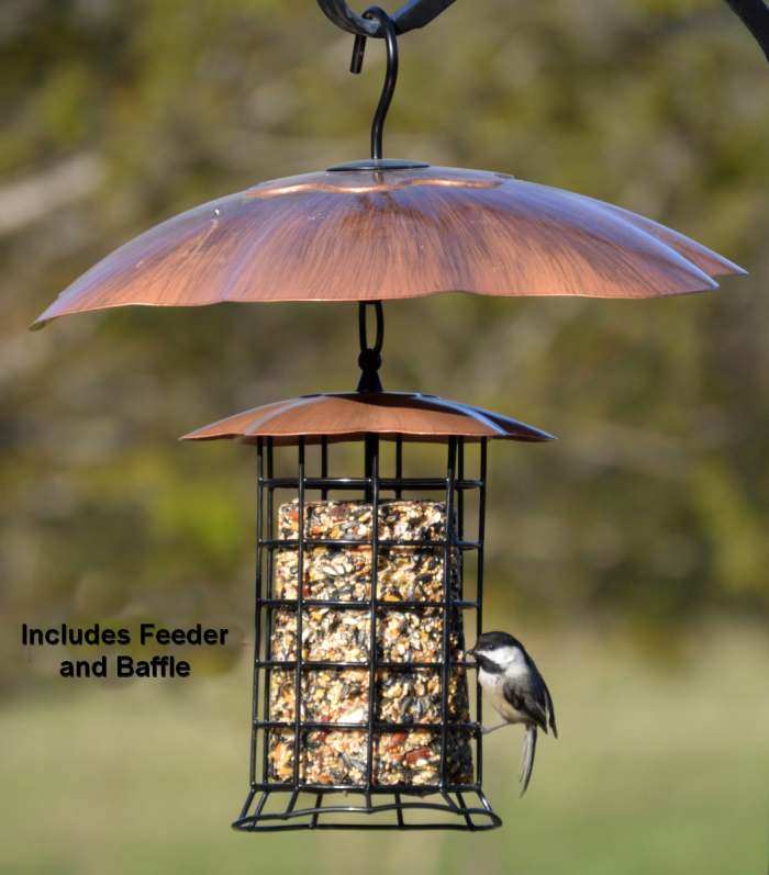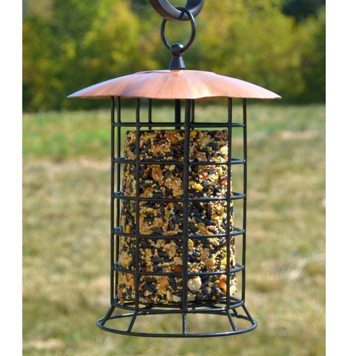 Our Songbird Copper Roof Suet Log Feeder's wire cage allows for multiple birds to feed at the same time. Ready to hang, easy to fill and clean. Weather durable metal construction with black vinyl coated cage. Roof has a brushed copper finish. Meaures 8" x 8" x 12". Perfect for using with standard size suet and seed logs. The Songbird Copper Roof Suet Log Feeder is a must have for attracting suet loving backyard birds including woodpeckers, nuthatches, chickadees, titmice and others.