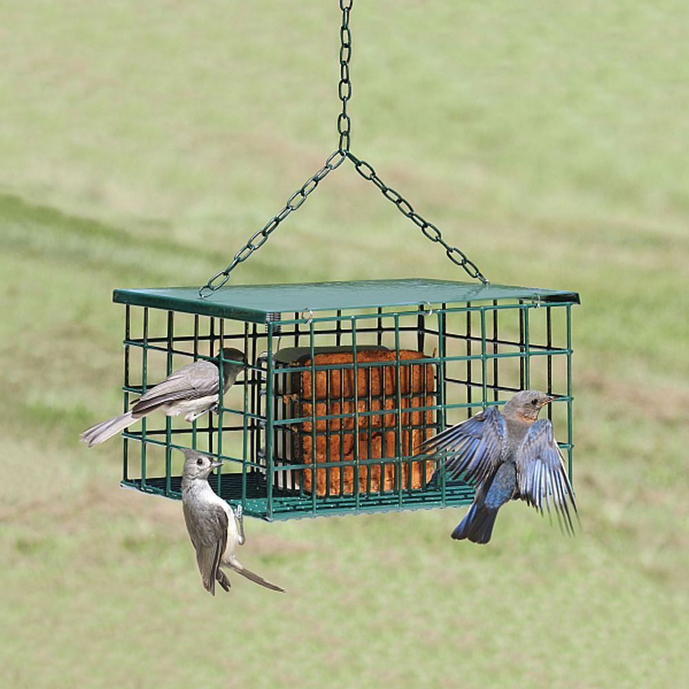 Chickadees, Nuthatches, and Woodpeckers will fly in and hang upside down when feeding. Majority of starlings and other large birds aren't able to do so. Uses one standard size suet cake. Plastic cover protects suet cake. Feeder includes wire cover and chain. 2 Feeders/Twin Pack