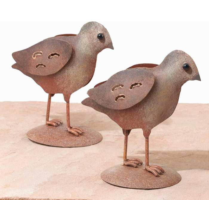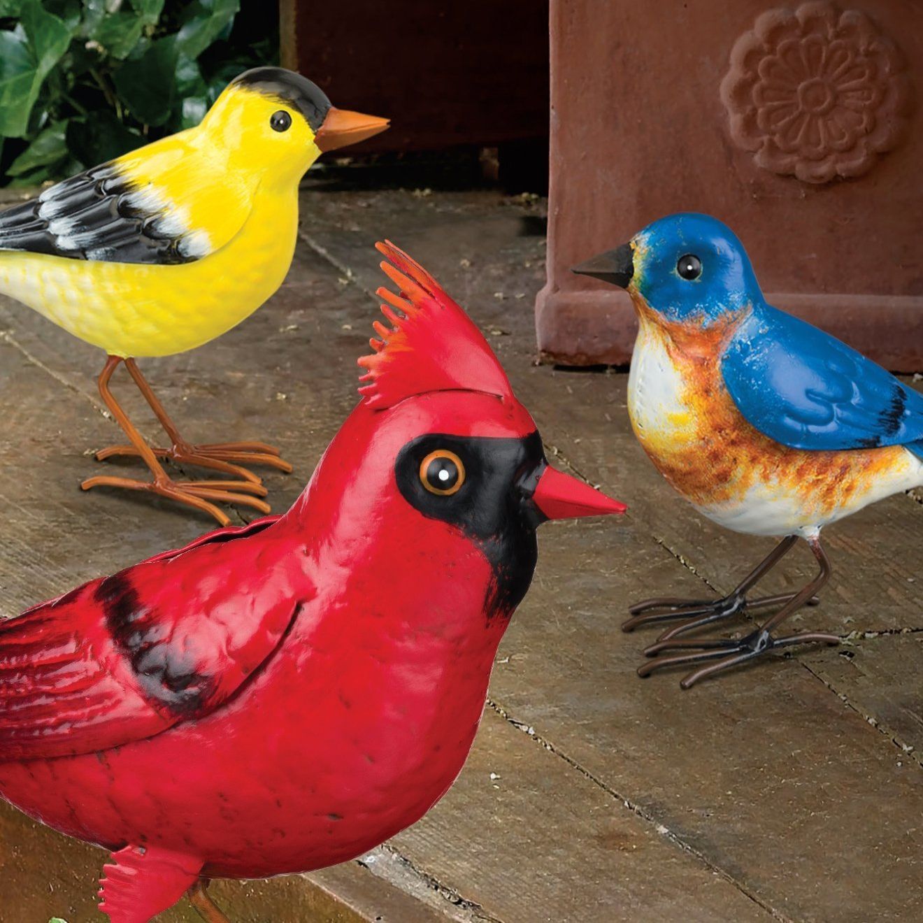 Set of 3 Songbird Decor Sculptures includes 1 each of the following: Bluebird, Cardinal, and Goldfinch! These statues can be placed in anywhere you would want this fun centerpiece to be displayed. Can be used to spruce up any garden with its fun 3D design, or can be placed in the home for a great conversation piece that will add a subtle, but eye-popping detail. This unique home and garden songbird accent was handcrafted out of a durable metal construction. Each Songbird 3-D sculpture is hand crafted and hand-painted so there will be subtle variations in finish and color. Intricately painted in soothing, eye-pleasing hues with durable automotive paint to withstand the elements and fading. Great for kitchen, breeze way, porch, and other areas around the home. Makes a wonderful décor piece for indoor or outdoor in a sheltered area. The perfect gift for the songbird lover and collector!