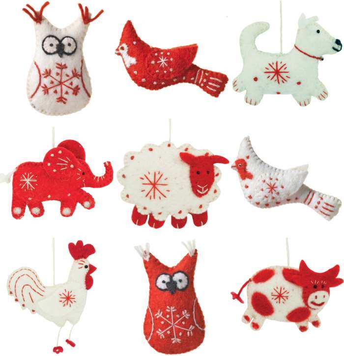 What's red and white and perfect for any holiday decor? Our beautiful classically modern line of stitched and stuffed holiday ornaments! Hand-stitched and needle felted features brings to life to the whimsical details. Lovingly soft to the touch because they are made with a fine natural wool. Handmade felt components are created and assembled by skilled artisans working in a fair trade production center in Kathmandu, Nepal. Excess water is drained into a neighboring garden for growing food. Traditionally handfelted with 100% natural woolen fibers. Made with renewable and recyclable material. Environmentally friendly, non-toxic, azo-free dyes. Wool scraps are recycled into new products. Comes with our festive "Fair Trade Holiday" tag. Perfect for decorating holiday trees, garlands, wreaths, or use as display accents. Wild Woolie Ornaments make wonderful gifts for the nature lover!