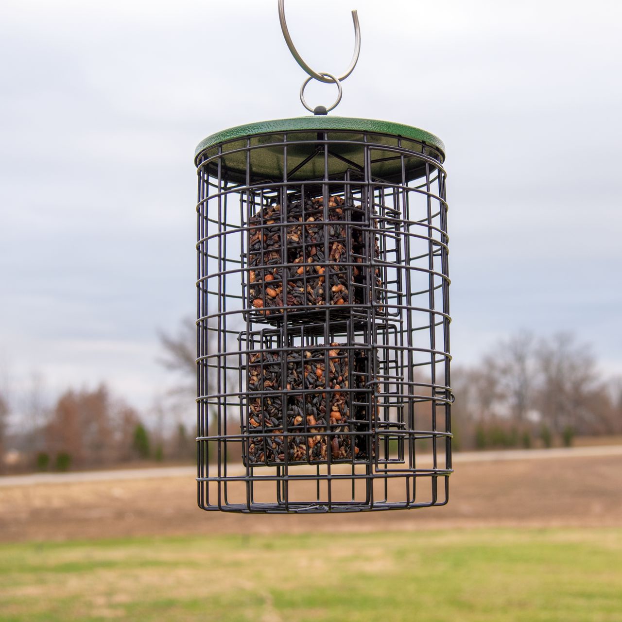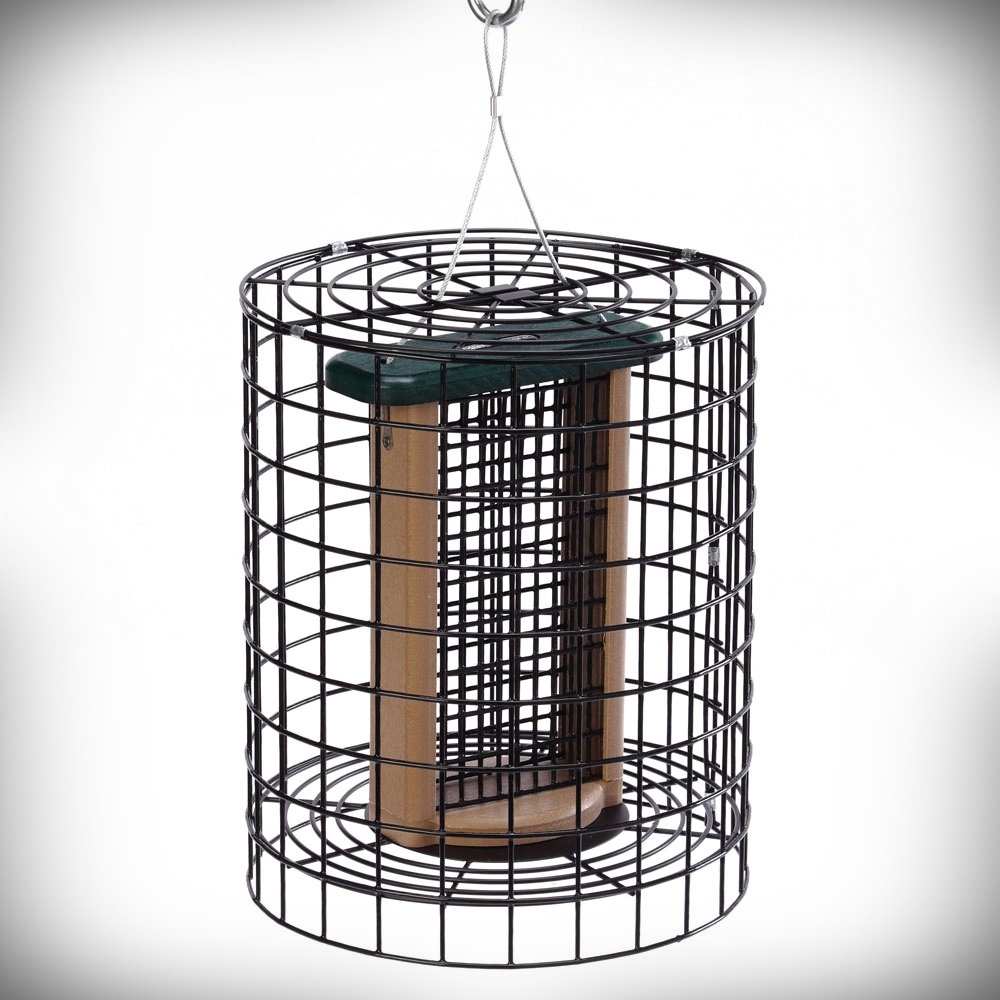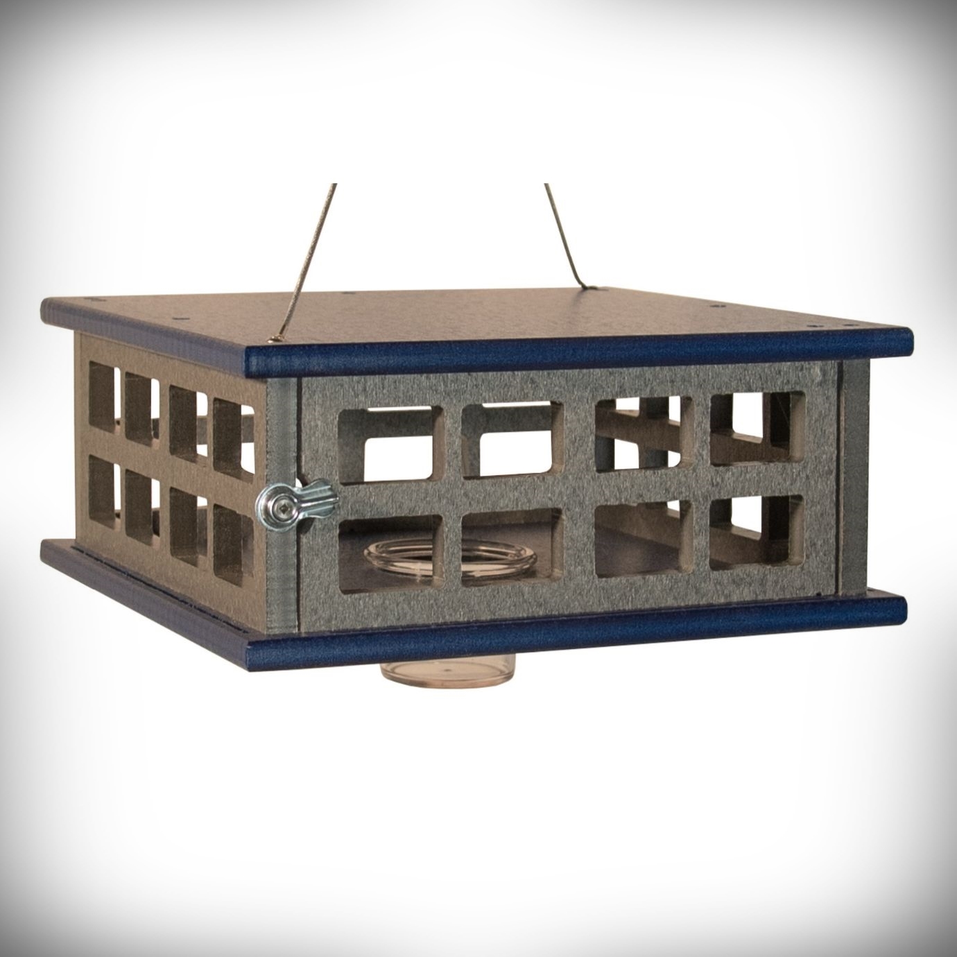 Recycled Poly Caged Bluebird Feeder Large - Constructed of eco-friendly recycled poly lumber built to last a lifetime! Guaranteed not to rot, crack, splinter, peel or fade! Put the lockdown on "bully" birds and critters with this mealworm feeder based on the design by Steve Gilbertson. Bluebirds and other desirable mealworm eating birds can come and go as they please while squirrels and European Starlings are thwarted. Now with 2 feeding cups, simply fill with mealworms or other desired food, open the "gate", and place the cups in the holes in the center of the feeder. For best results place near a water feature such as a birdbath. North American Bluebird Society (NABS) Approved. Proudly made in the USA! North American Bluebird Society (NABS) Approved. Made in the USA!