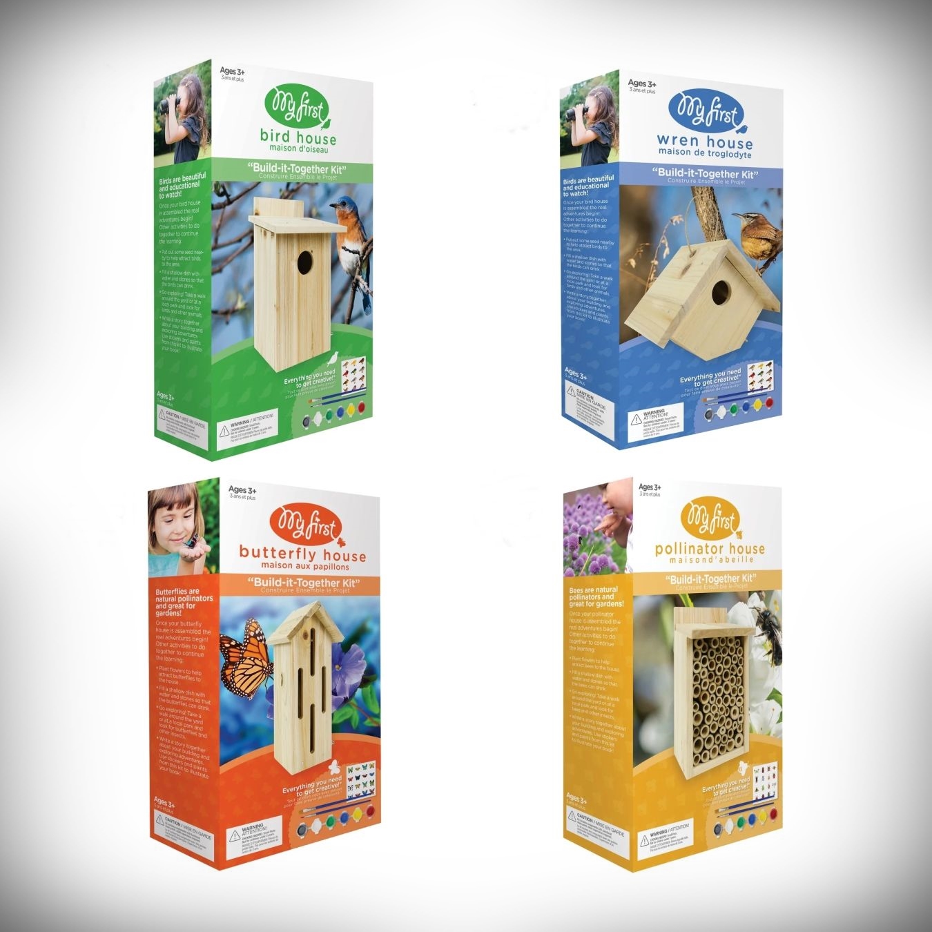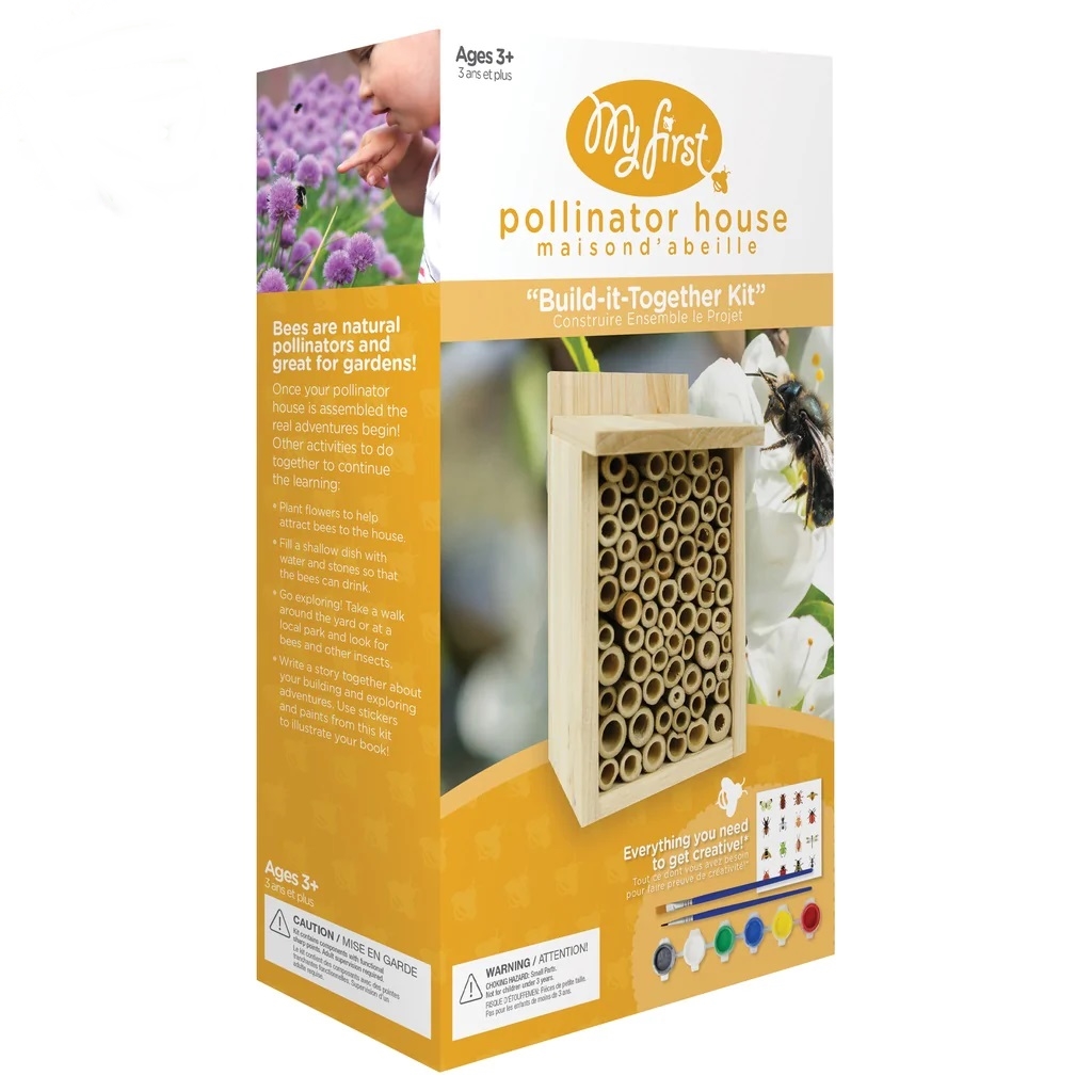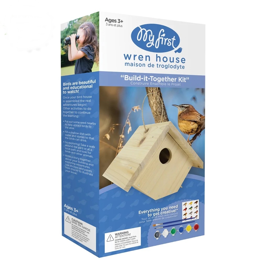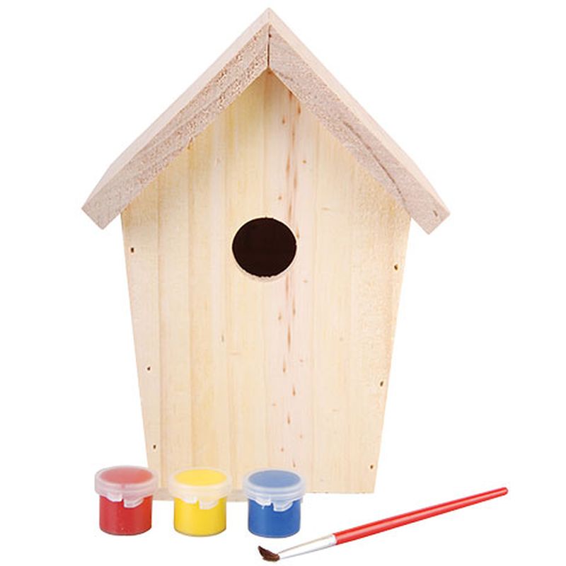 Paint Your Own Bird House Kit For Kids - Foster the artist in your child with the Kid's Paint Your Own Bird House. This compact, wooden structure not only offers birds a fantastic roosting spot; its unadorned exterior provides plenty of places for your child to express her or himself. The package includes small bottles of yellow, red, and blue acrylic paint, along with a paintbrush for ease of application. These colors may be blended together to make a wealth of other hues, and the smooth exterior of the nest box provides a fantastic canvas for your child. The 1" diameter entry hole enables small birds to use this shelter, and the base removes fully for seasonal maintenance. A keyhole opening on the back allows you to place this item against a post or wall using only a nail, and the wooden body remains durable all season. Designed for ages 6 and above.
