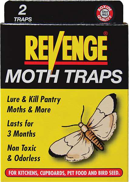 Attract and capture various pantry moths with Bonide Revenge Moth Traps. This set of four odorless, yet powerful, traps attract and capture pantry moths that are found in flour, rice, crackers, dog food, bird seed, and cereals. Each trap uses a special pheromone lure to trap the male moth, thereby disrupting the life cycle so that egg laying ceases. Lasting for up to three months, continued use of the traps ensures that any earlier laid eggs will be caught when they emerge as adults. Because these traps are also non-toxic, they can be safely placed near food storage and food preparation areas. Protect your pantry, kitchen, or other food storage areas with Bonide Revenge Moth Traps. 4 Ready To Use Traps/Pack. Made in the USA!
