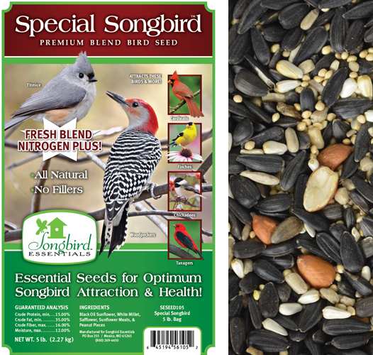 Songbird Special Bird Seed 5#. Essential Seeds for Optimum Songbird Attraction and Health. Premium Blend Bird Seed with Nuts. This healthy seed line was proudly developed to meet the growing needs of the birding enthusiast. This product will attract a remarkable selection of birds to your feeders. All natural and packaged for full view of its quality ingredients. All Natural and No Fillers. Birds this feed attracts include: Cardinals, Finch, Chickadees, Woodpeckers, Titmice, Tanagers and more! Ingredients: Black Oil Sunflower, Sunflower Meats, Peanut Pieces, Raisins, and Dried Cherries. 5# bag. Made in the USA!