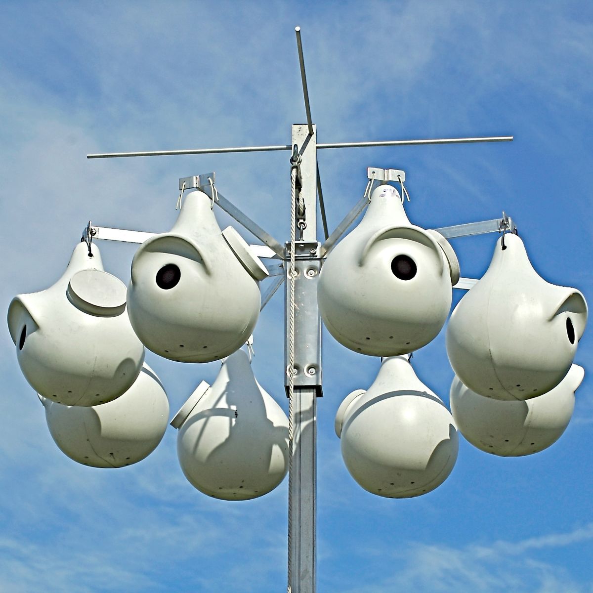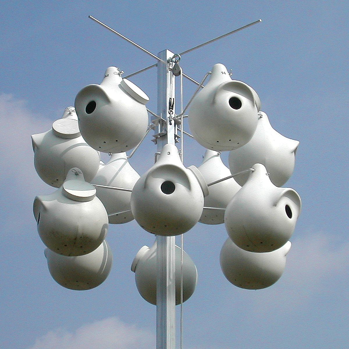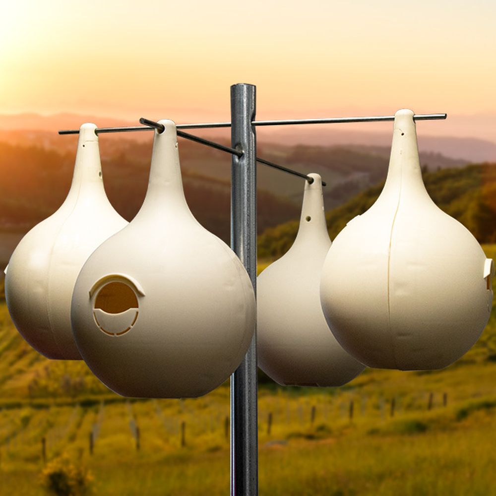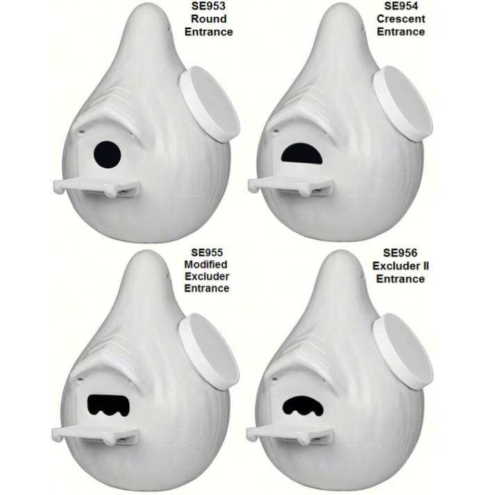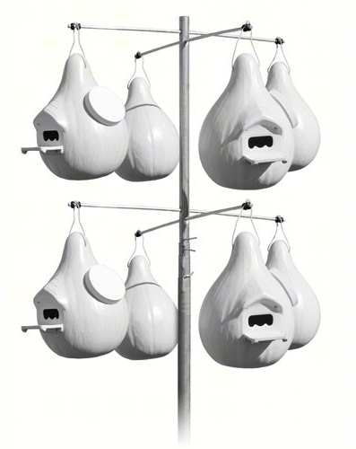 Purple Martin Lover's Two Piece Gourd 4/Pack - Offer fantastic and comfortable housing for wonderful purple martins in your bird garden with the Purple Martin Lover's Two-Piece Martin Gourds. This handy pack of 4 gourds lends delightful martins a safe and reliable set of roosts, while adding variety and interest to your yard. Each gourd features a front and back section which interlock for sturdy assembly, while an included screw toward the slender, top neck keeps each nest securely joined. The rounded base of each gourd forms an expansive, 7" diameter nesting area, and the crescent-shaped entry helps discourage larger birds from invading the dwelling. If starlings are not a concern, use the perforations to remove the extra material at the base of the entry, transforming it into a 2.125" diameter, round opening as an alternative.