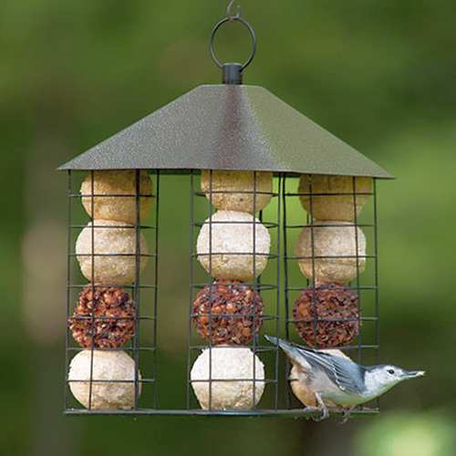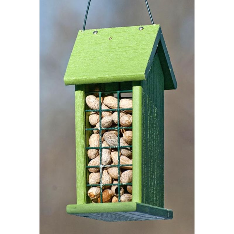 Going Green Recycled Plastic Whole Peanut Feeder - Create a hardy and versatile feeding spot in your yard with the Going Green Recycled Plastic Peanut Feeder. Adding a peanut feeder to your garden provides treats for a wide variety of birds, as well as squirrels and other animals. The recycled plastic, lime green frame on this item brings not only bold color to your yard; it also adds an environmentally sound hint. A green, coated metal grid forms two sides of this feeder, creating a reservoir which holds up to 0.75 quarts of peanuts in the shell, a few suet balls, or even a suet log. Proudly made in the USA!