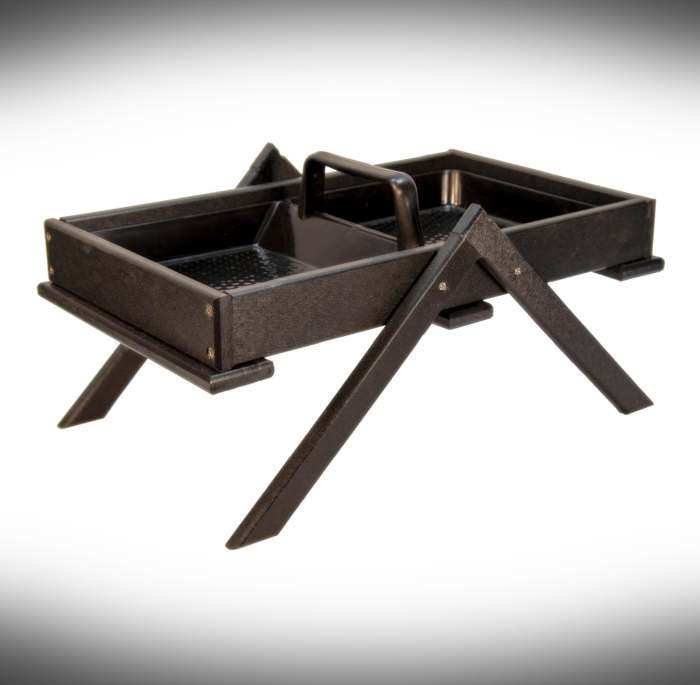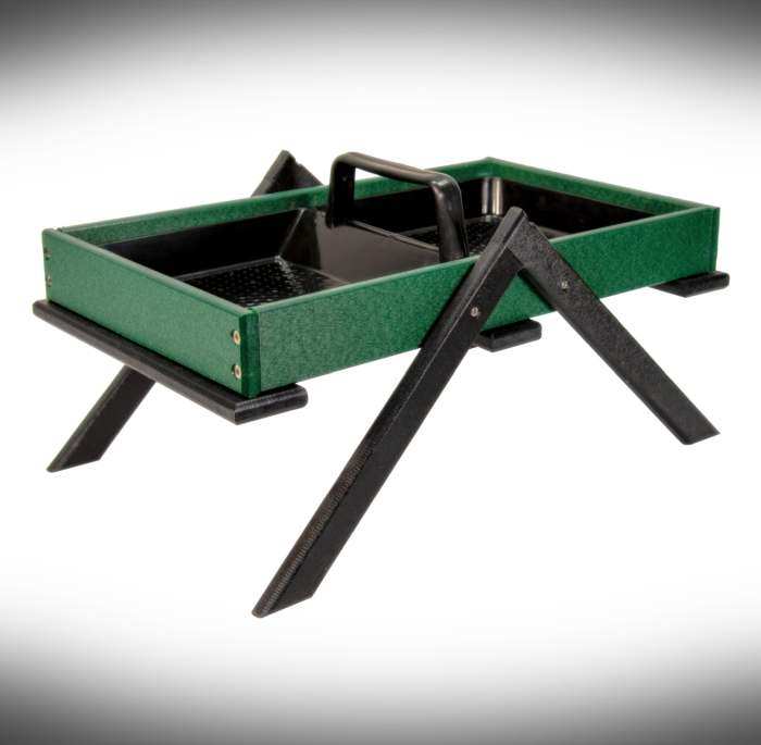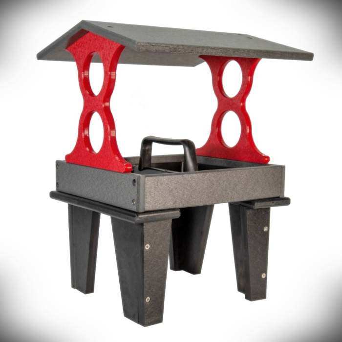 The Giant Fly-Through Covered Ground Bird Feeder is one of the largest bird feeders out there. The feeder is constructed out of recycled poly lumber that will never crack, split or fade from normal weather exposure. Designed to last a lifetime. This massive ground platform bird feeder can hold up to 16 cups of bird seed meaning you don't have to fill the feeder every day! Each side of the removable tray can easily hold 8 cups of seed. The fly through design lets birds stop by for a bite while they're flying around your yard or just hang out and socialize on the sides of the feeding tray. The removable tray is equipped with drainage holes so between the holes in the tray and the roof, you don't have to worry about your seed tray overflowing with water or snow. Backyard critters of all sorts love this feeder as it is low enough to the ground to feed squirrels, chipmunks, ducks and your backyard birds all at the same time.