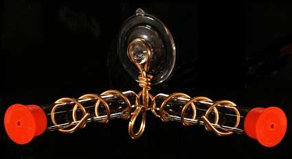 Contemporary in design. The Whimsy Three Station Hummingbird Feeder is one of our top sellers year after year. The three ruby marble dangles and red caps attract hummers like a magnet. Constructed of solid heavy gauge copper. It has 3 double wall thick glass feeding tubes. The bottom hook is prefect for hanging a flowering basket, windchime, windsock, or to even daisy chain another feeder. Makes a wonderful gift for the hummingbird lover! Proudly handcrafted in the USA by skilled artisans!