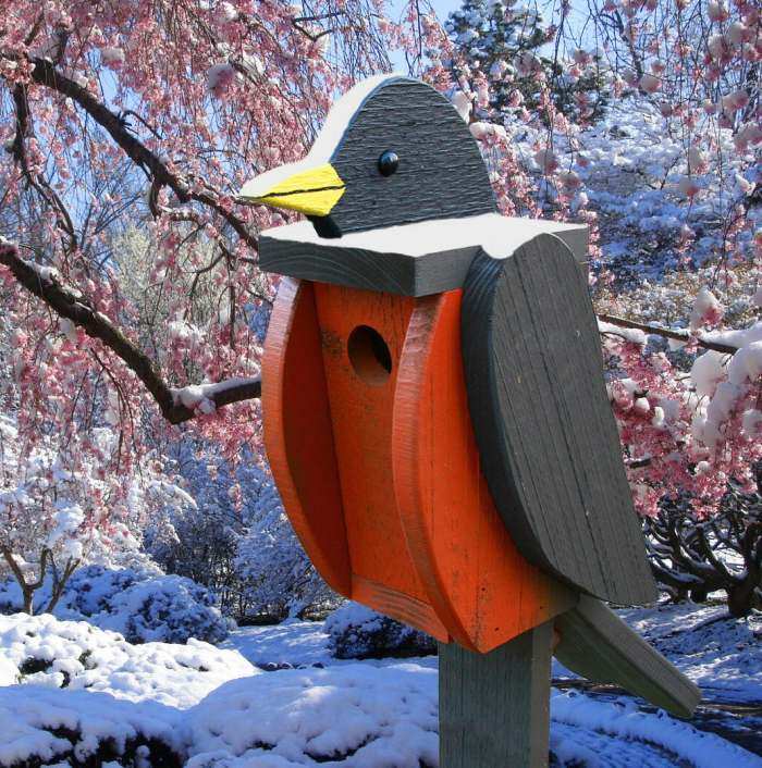 Bring your favorite birds flocking to your garden with this wonderfully designed bird house! Eye-catching and beautiful, this delightful bird house in the shape of a American Robin brings joy and birdsong to the garden or porch. Each of these birdhouses is lovingly handcrafted from solid wood by an Amish woodworker in Pennsylvania, so you can expect years and years of enjoyment from each of these beautiful birds. Built for year-round exposure to the outdoors, every bird house is built with quality wood, aluminum hardware, construction-grade exterior screws and sealed with exclusive color exterior-grade paints. And best of all, they have proven to attract birds of their color as well as many other local songbirds. 1-1/2" diameter entrance hole is perfect for bluebirds and other songbirds. Air flows through the nest via holes on the bottom. Unscrew the top to clean after each season. Post mount. Made in the USA!