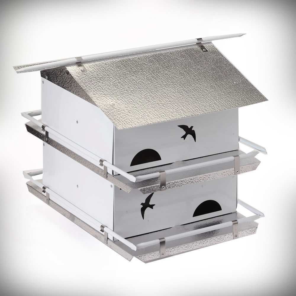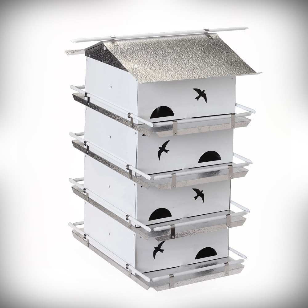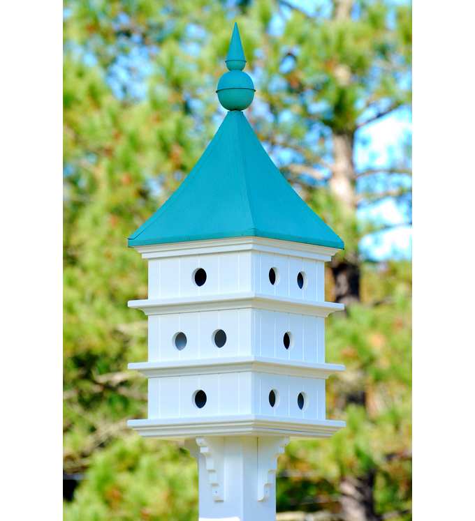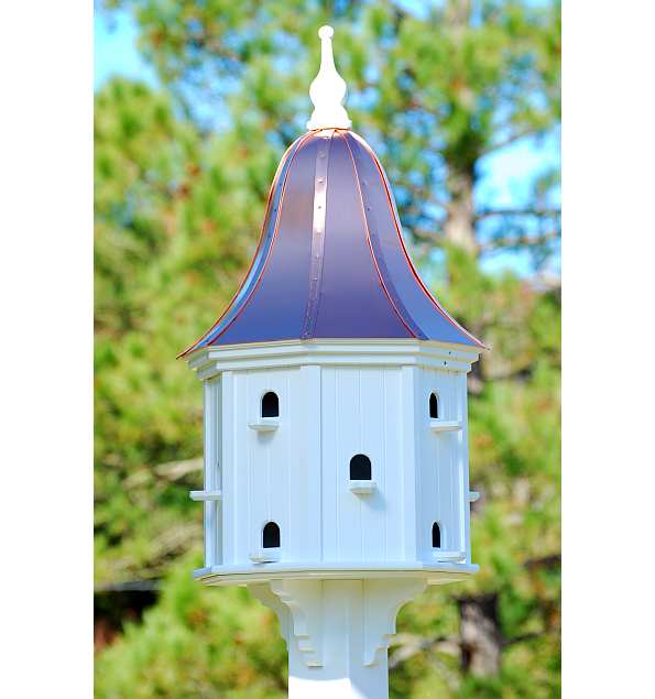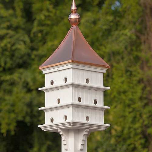 Fancy Home Products Purple Martin House 14 Inch Twelve Compartment Bright Copper Roof. Measures 36" high x 14" wide, 1-7/8" x 2" openings perfect for Purple Martins, square shaped, PVC construction, 8 nesting compartments, 8 perches, brackets attached, removable solid copper roof for easy cleaning, fits on 4" x 4" vinyl sleeve post which fits over 3 1/2" x 3 1/2" wood post (sold separately). Looks outstanding in any garden landscape. Proudly made in the USA. Attract colonizing Purple Martins to your garden sanctuary with the beautiful Fancy Home Products 14" Eight Compartment Purple Martin House with Bright Copper Roof!
