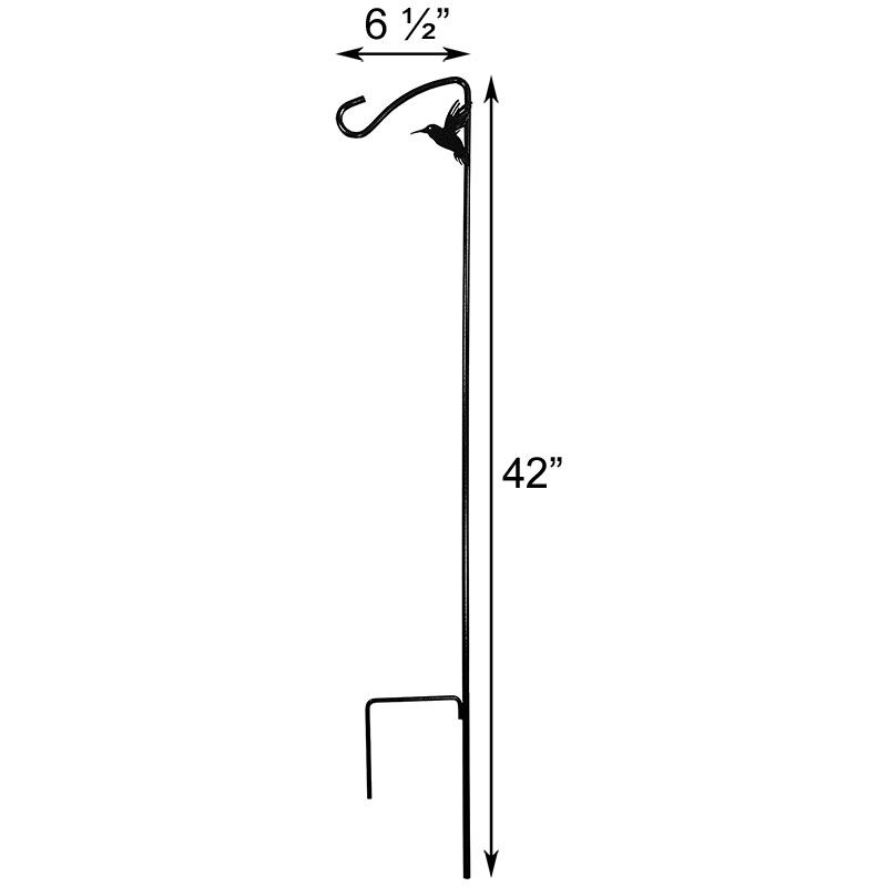 Hummingbird Hook 42" Black - Our Hummingbird Hook is ideal for bringing hummingbirds to your backyard garden. Place this charming accessory in your garden or flowerbed and hang your hummingbird feeder from it to attract these flying jewels to the area. A hummingbird silhouette rests near the top of the hook, bringing style and interest to the unit. This 42" hook easily holds small bird feeders, ornaments, lanterns or lights, and also works perfectly as a garden marker. A convenient step-in base provides a strong, 9" anchor for the entire hook. The Hummingbird Hook is constructed from lasting steel, and its weather-resistant, black finish remains beautiful for many seasons.