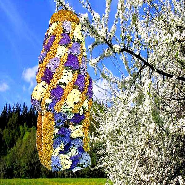 The beautiful Flower Millet Swirl Edible Birdhouse is made from white proso millet, red proso millet, and sunflower seeds on wood frame decorated with dark/light purple and white berries and golden spray millet. Hanger included. 1-1/4" opening perfect for small songbirds such as wrens, chickadees, nuthatches, titmice and others. Our handcrafted edible bird houses are made from 100% all natural ingredients that backyard birds love!