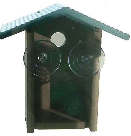 Watch all this house activity from inside of your house! The 1/4" diameter opening hole of the Recycled Plastic Window Wren House is sized just right for house wrens, chickadees titmice, nuthatches and other small songbirds. This recycled wren house comes with suction cups and a clear Plexiglas back so you can view bird activity from inside your home. Attach the clear Plexiglas panel to your window and slide the house into the Plexiglas panel to seat.