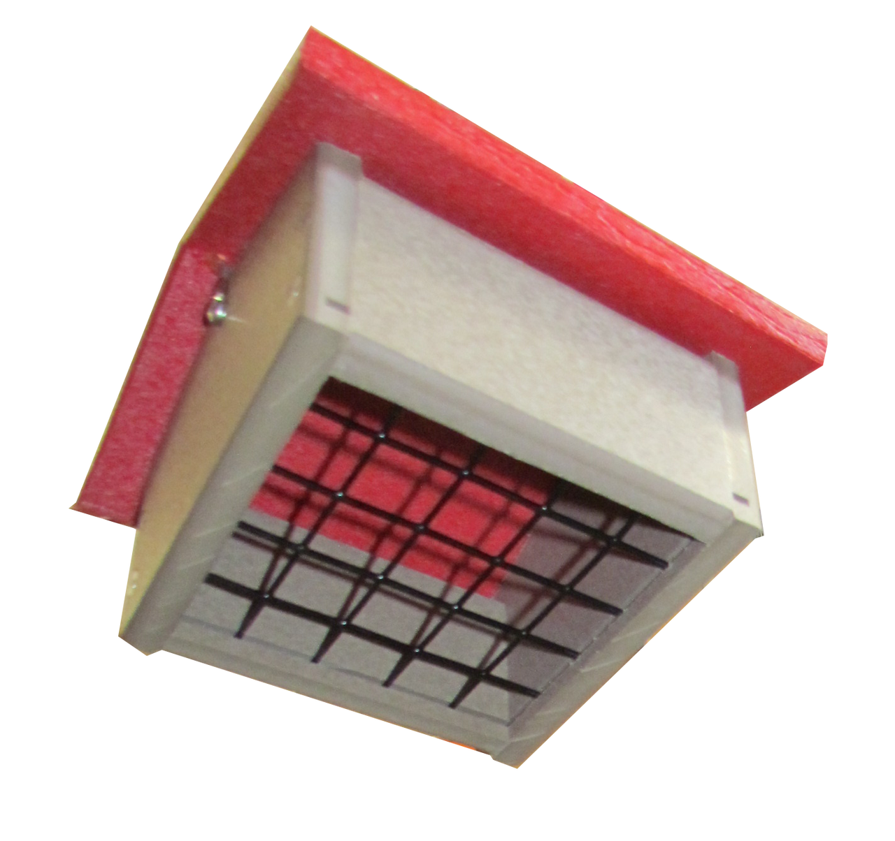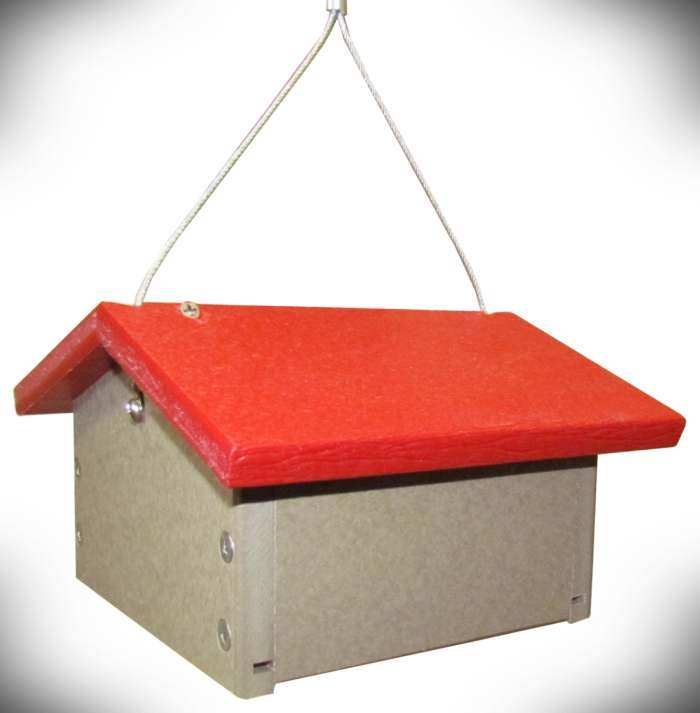 These quality crafted eco-friendly hanging upside down suet feeders are made from durable weather resistant 100% recycled poly lumber. Guaranteed not to fade, peel, rot, crack, chip, or warp. Helps prevent starling and blackbirds. Easy for birds to see suet. Rust-free stainless steel screws. Hanging cable included. Easy to clean and fill. Red and taupe poly color. Holds 1 standard suet cake. Proudly made in the USA!