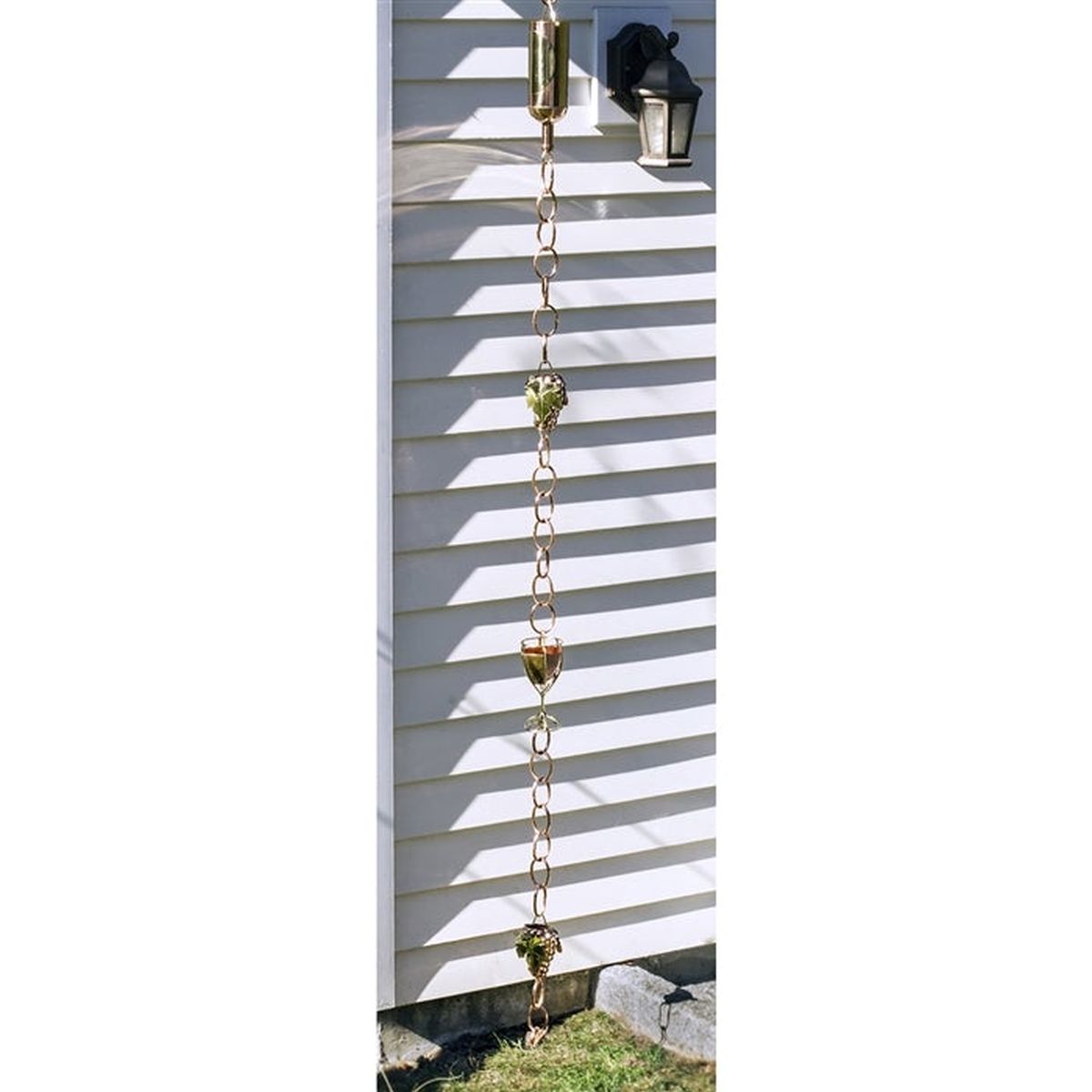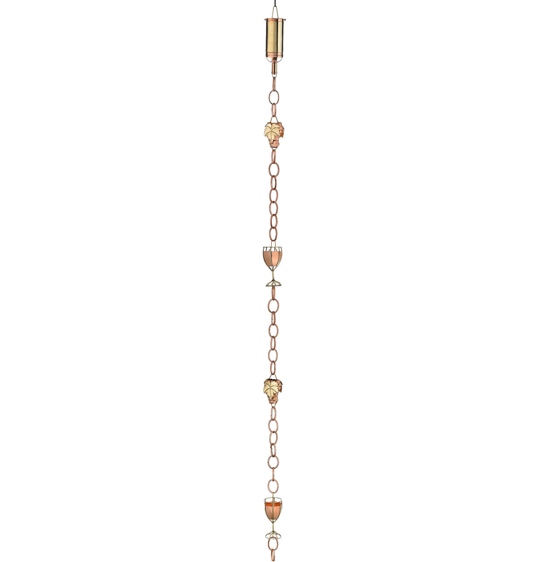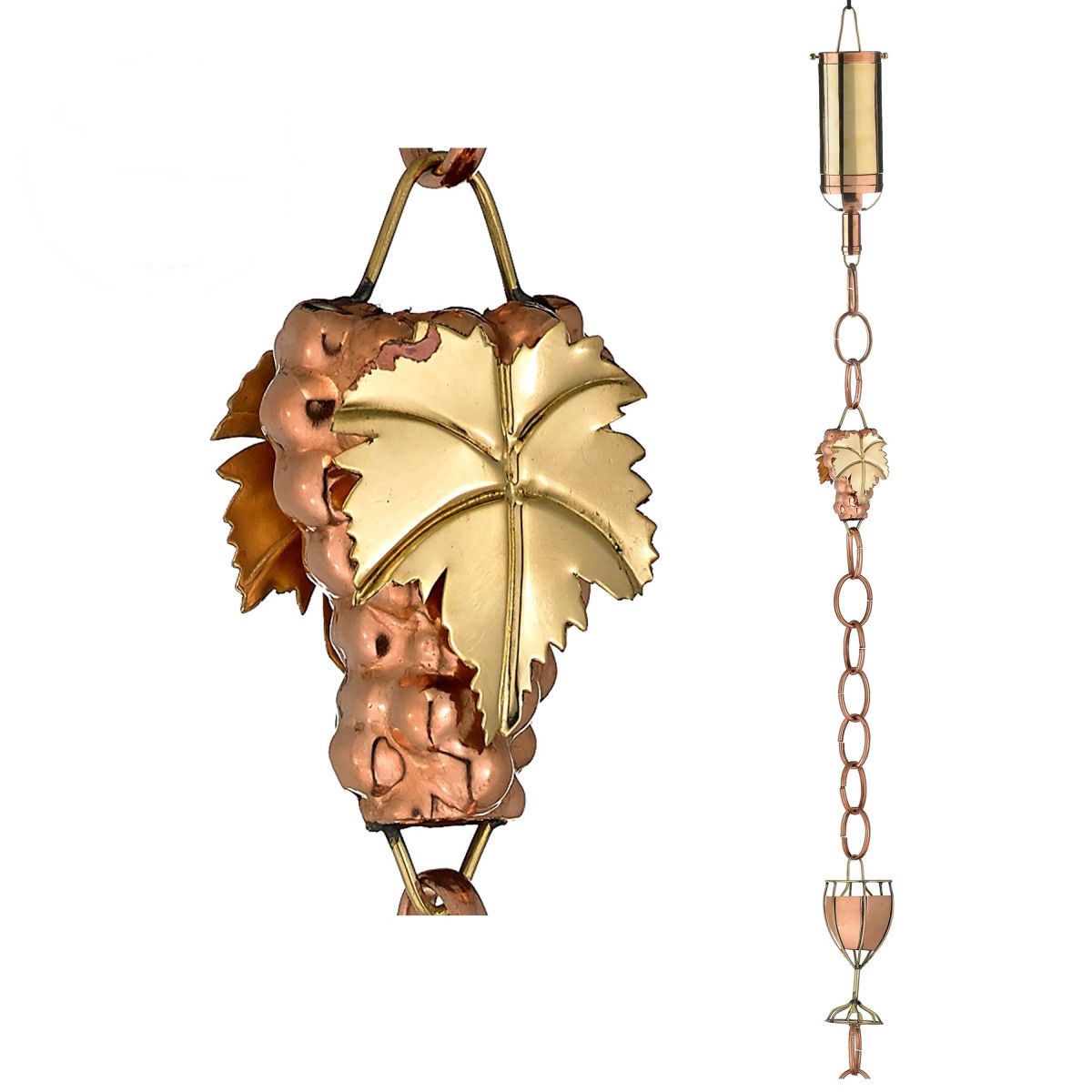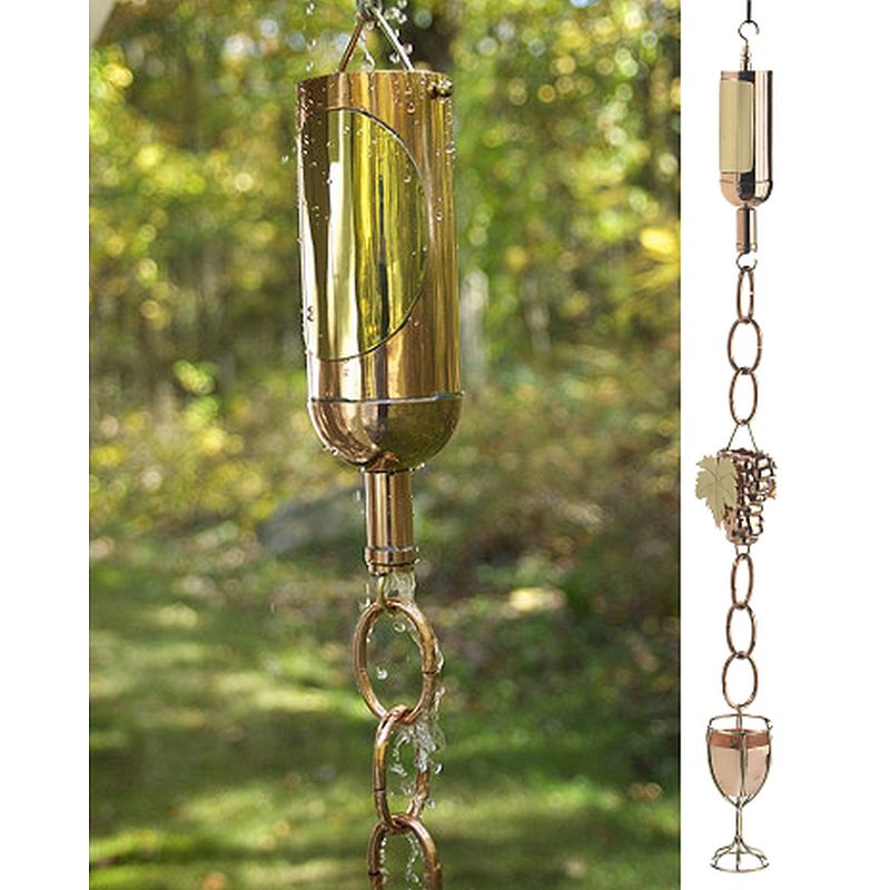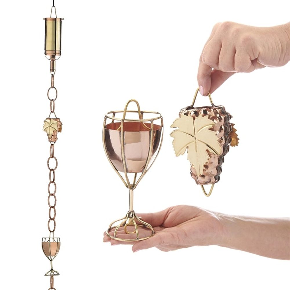 For wine lovers everywhere, our Wine Bottle with Grapes and Glass Rain Chain will allow you to sit back and sip on a glass of wine and enjoy the rain. Originating hundreds of years ago in Japan, rain chains act as linked funnels that are a decorative alternative to the cheerless gutter downspout. Rainwater playfully dances and flows down these handcrafted channels, creating a delightful focal point for your outdoor enjoyment. Handcrafted in the Old World style with superior workmanship 80 inches long, durable Polished Copper develops a beautiful patina over time. Easy to install on any home - comes with gutter installation clip.
