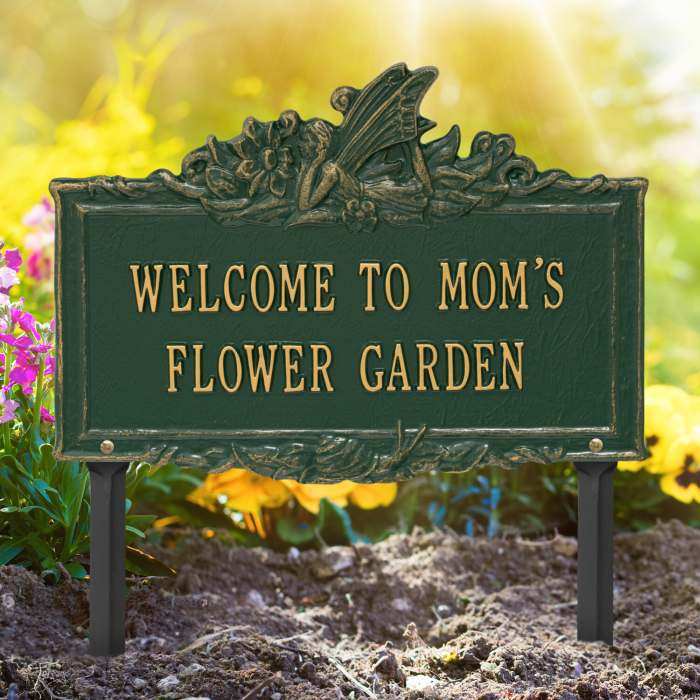 Each custom made sign is hand cast one at a time, ensuring quality. A detailed graphic decorates the Personalized Lawn Garden Sign with a whimsical fairy at the top.