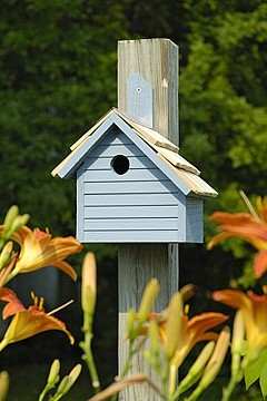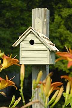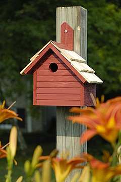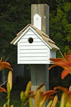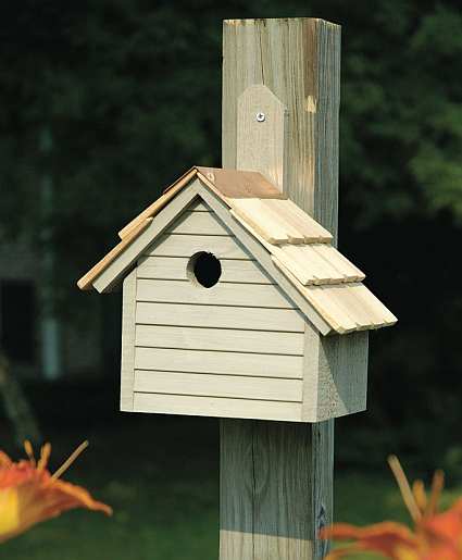 Charming New England design finished with beautiful Heartwood stonewashed hand-cut shingled roof, copper trim and rich semi-transparent stain (non-toxic, of course!) give this home real character, while great ventilation and drainage and convenient rear clean-out door mean years and years of delightful use. 1-1/4" entrance hole will invite in wrens, chickadees, nuthatches, and many other songbirds.