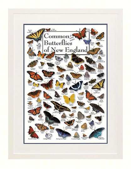 This stunning poster includes 79 species of butterflies both common and exotic of the New England region. The images are by Rick Cech, well known naturalist and butterfly expert, author of Butterflies of the East Coast (Princeton University Press, 2005). 19 X 27 inch overall size, the poster comes in a heavy-walled 2 inches mailing tube with plastic end caps. Printed on 80 pound coated stock using fade resistant inks and the highest production values, it is truly of museum quality and suitable for framing. Made in the USA!
